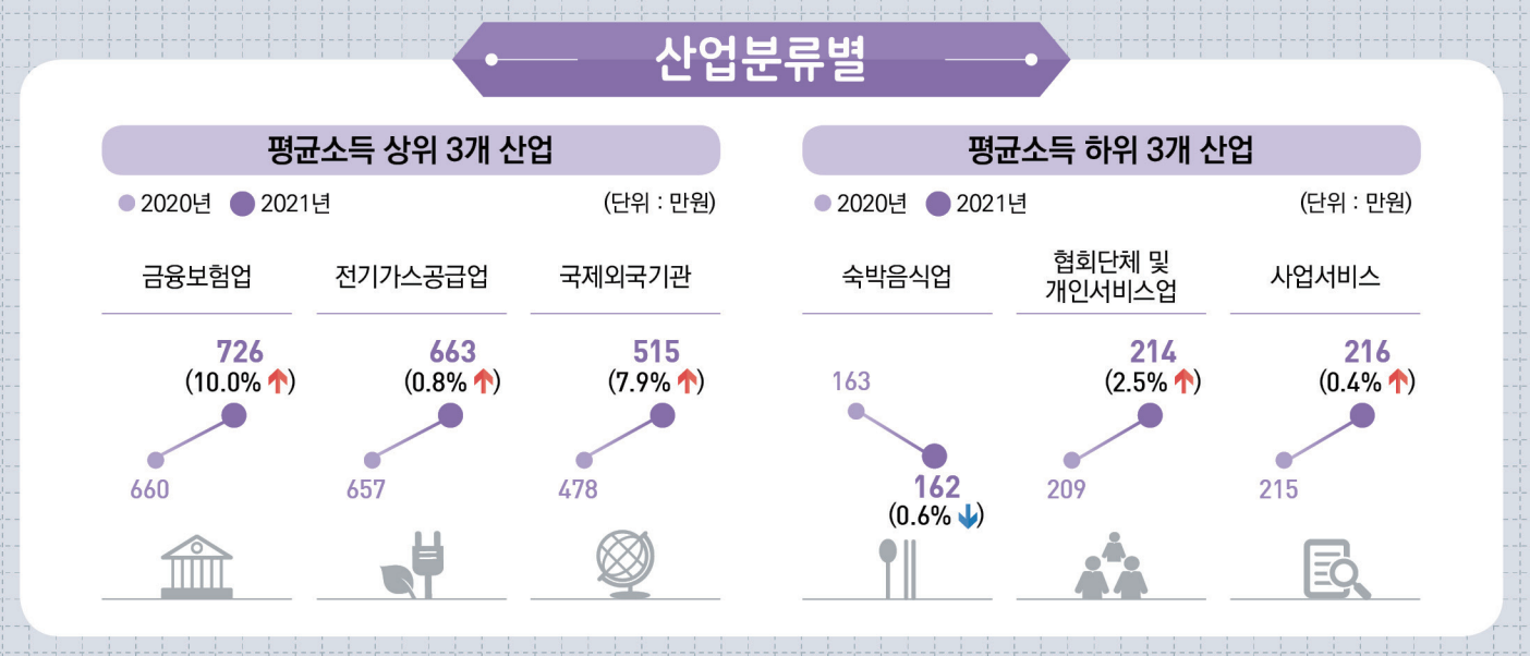 그렇다면 돈은 어떤 직군이 가장 많이 벌고 있을까요? 가장 많은 소득을 올리는 직군은 바로 금융·보험으로 726만 원이었습니다. 반면, 가장 소득이 낮은 직군은 숙박 및 음식점업으로 162만원이었습니다.