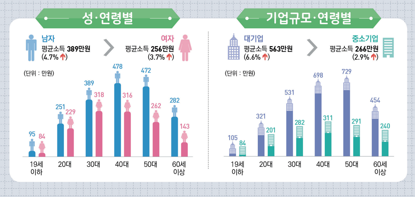 연령별로는 40대의 평균소득이 414만 원으로 가장 높았는데요. 성별 평균 소득은 남자 389만 원, 여자 256만원으로 남자가 여자보다 약 1.5배 더 많았습니다.
