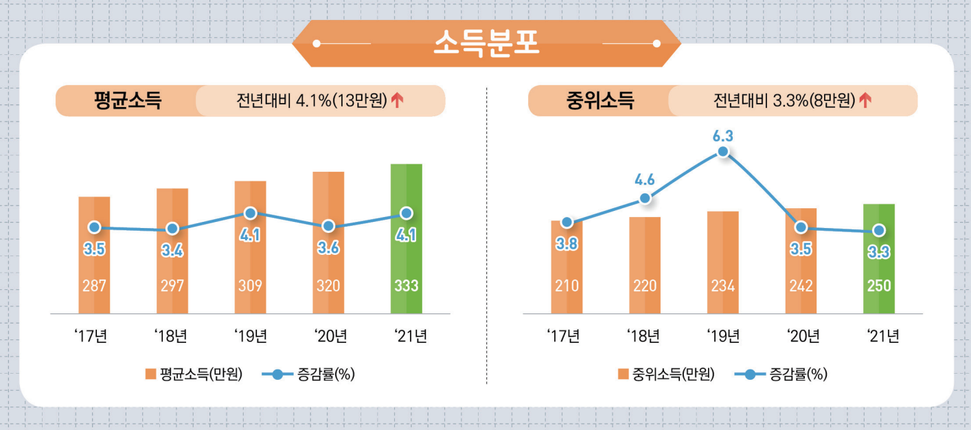 통계에 따르면 국내 직장인의 평균 소득은 월 333만원이며, 중위 소득은 250만원입니다. 이는 전년대비 각각 13만원(4.1%), 8만원(3.3%) 증가한 수치입니다.