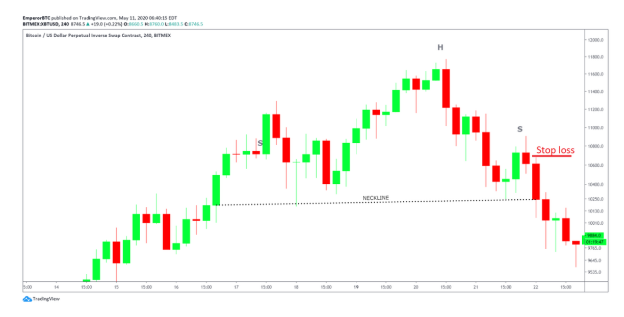 다음으로 스탑 로스는 헤드 앤 숄더 패턴이 완성되며 넥라인이 무너지는 시점 직전에 있는 캔들의 고점에 걸어둘 수 있습니다. 스탑 로스에 대해 잘 모르신다면 스탑 로스를 활용하는 자세한 방법도 살펴보세요.
