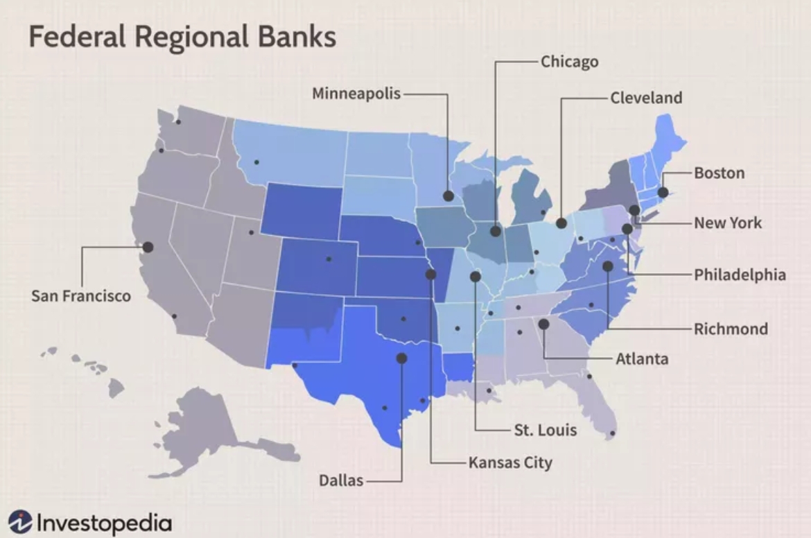 미국에는 12개의 연준은행이 있습니다. 미국은 12개의 연방준비구로 나뉘어 있는데요. 각 지역마다 연방준비은행이 있습니다. 12개의 은행은 뉴욕, 댈러스, 리치몬드, 미니애폴리스, 보스턴, 샌프란시스코, 세인트 루이스, 시카고, 애틀랜타, 캔자스시티, 클리블랜드, 필라델피아입니다. 이들을 합쳐 연방준비은행(Federal Reserve Bank)라고 합니다.