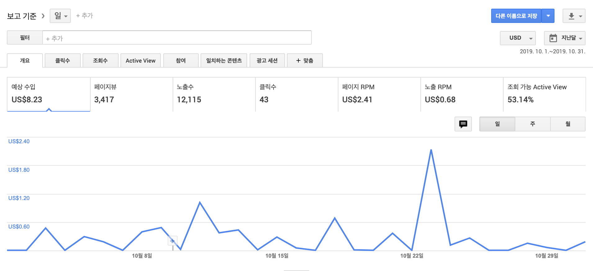 위 사진에서 보시듯 10월 한 달간 발생한 애드센스 수익은 총 8.23불입니다. 3,417 페이지뷰를 달성하고 12,115건의 노출 그리고 총 43건의 클릭이 있었습니다. 페이지 RPM은 들쑥날쑥 했었는데요. 평균 2.41불을 기록하고 있습니다. 참고로 페이지 RPM이란 '예상 수익을 페이지 조회수로 나눈 다음 1,000을 곱합 값'입니다. 노출 RPM은 0.68불을 기록하고 있는데 이는 '예상 수익을 노출 수로 나눈 다음 1,000을 곱한 값'입니다.