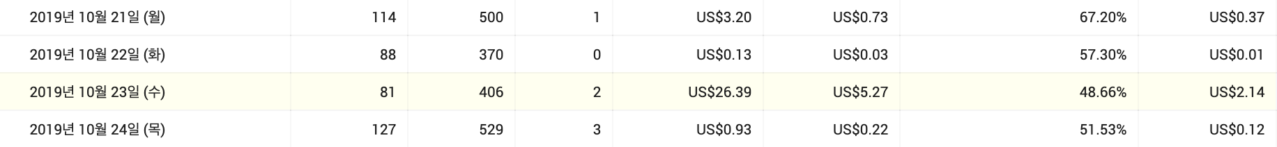 위 사진은 상당히 높은 광고 단가를 기록했던 날인데요. 평균 1불 내외를 기록했던 것과 달리 해당 날짜에는 26.39불을 기록했습니다. 어떤 이유로 이렇게 높은 단가가 적용됐는지는 모르겠지만, 이렇게만 나와준다면 꼭 높은 조회수가 아니더라고 높은 수익을 올릴 수 있지 않을까 싶습니다.