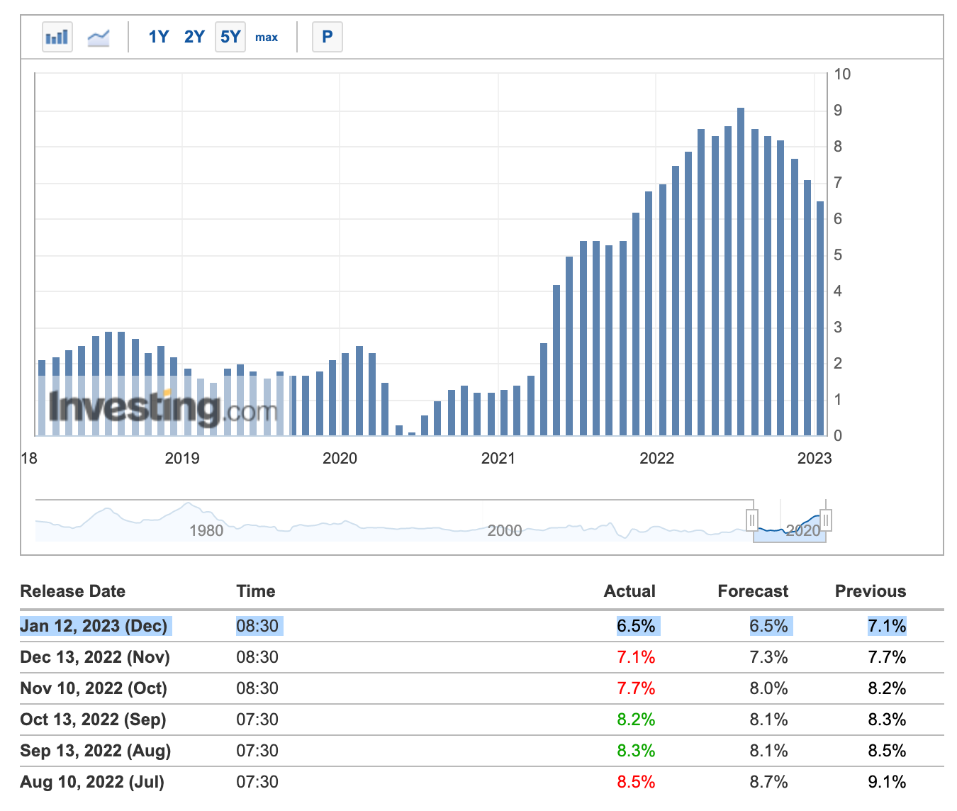 12월 미국 소비자물가지수(CPI)가 발표됐습니다. 수치상으로는 1년 전보다 6.5% 상승했고, 지난달보다 0.1% 하락했는데요. 시장 컨센서스에 부합했습니다. 12월 CPI는 가파르게 오르던 물가가 슬슬 꺾이기 시작하면서 인플레이션이 점차 완화되는 것으로 해석할 수 있습니다.