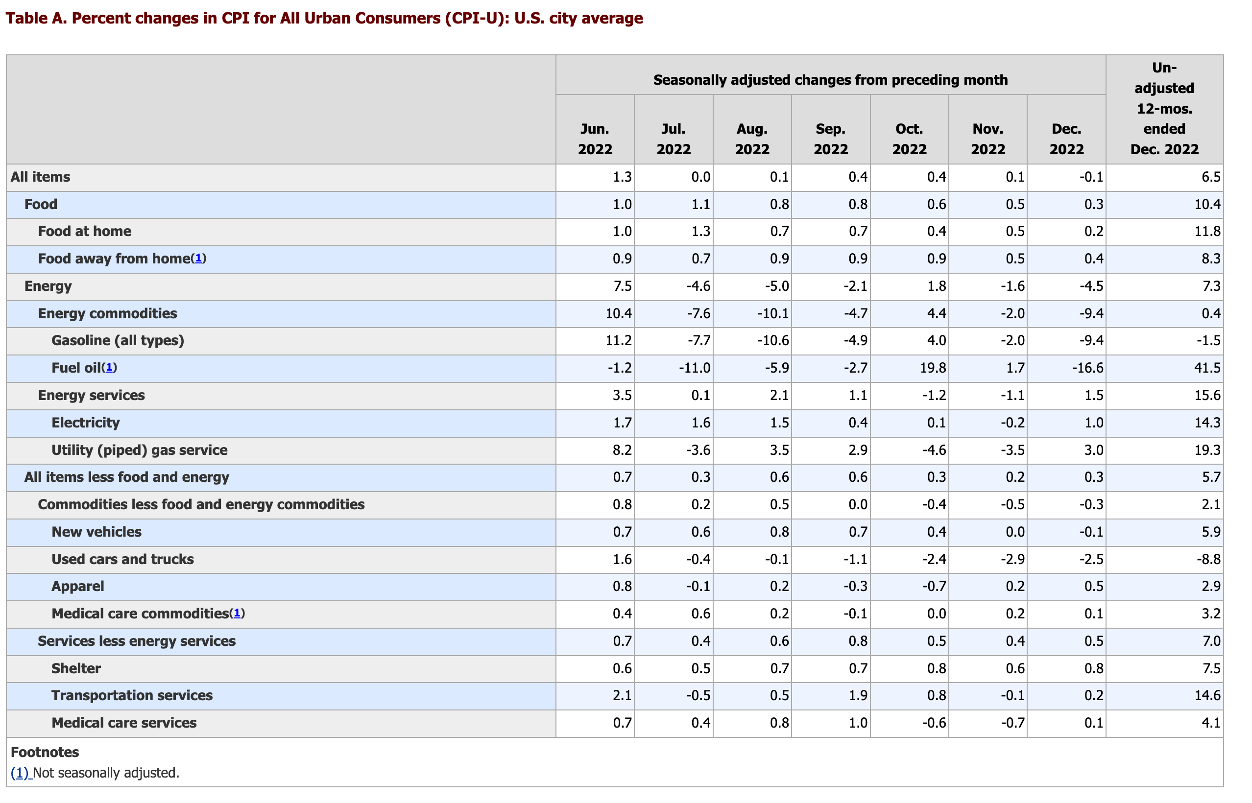 CPI 세부 항목은 미국 노동 통계청에서 보실 수 있습니다. 12월 CPI는 전반적으로 에너지 부분의 하락이 컸고, 특히나 휘발유 가격이 9.4%가량 하락했습니다. 다만, 주거(+0.8%)나 교통(+0.2%), 의료(+0.1%) 물가는 조금씩 올랐습니다.