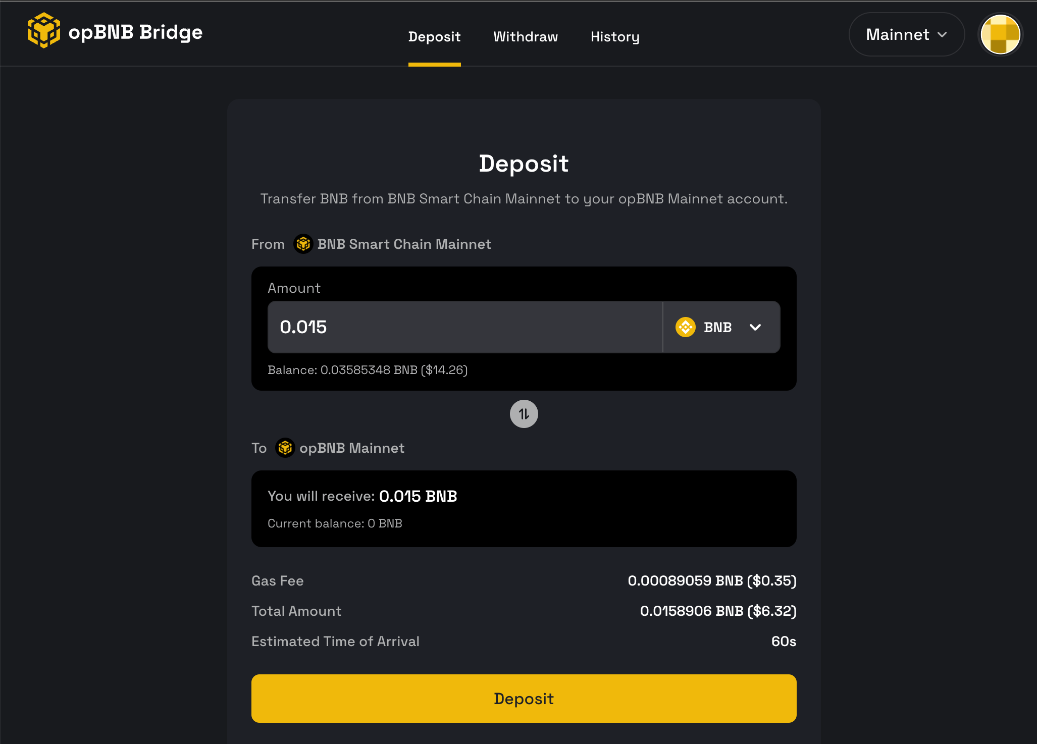 opBNB 브리지를 사용하여 바이낸스 스마트 체인에서 opBNB로 자산을 전환할 수 있습니다. 자산을 전환하려면 트랜잭션에 브리지에 지갑을 연결한 다음 입금[Deposit] 버튼을 누르면 됩니다. 이때, 필요한 가스 수수료를 지불하기 위해 약간의 BNB를 보유하고 있어야 합니다. 트랜잭션 처리 속도는 대략 10초 내외입니다.