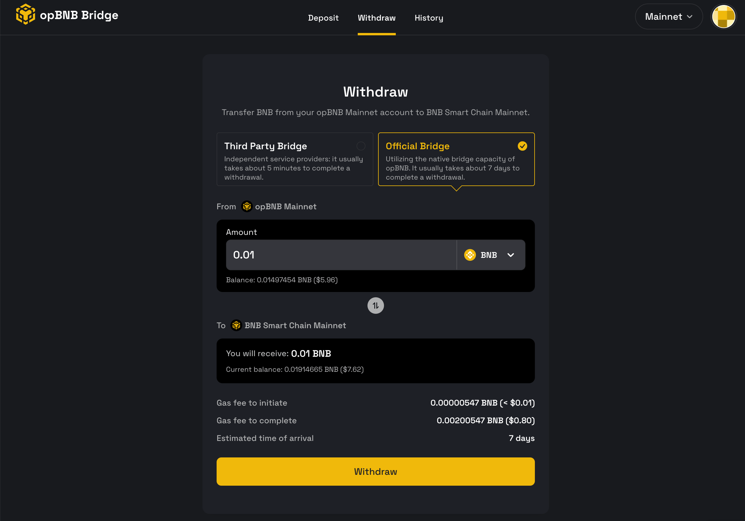 opBNB 메인넷의 경우에는 BNB 스마트 체인으로의 전환 및 자산 출금에 약 7일의 시간이 소요되며, opBNB 테스트넷의 경우 2시간 정도가 소요됩니다.