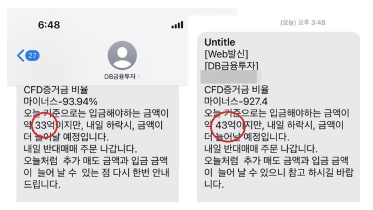 SG 증권을 통한 CFD 대규모 매도세가 쏟아지며 개인 투자자들 또한 큰 손실을 기록했습니다. CFD 계좌 청산으로 인해 증거금의 수배에 달하는 손실을 물어야 하는 경우가 발생하고 있으며, 증권사들은 신규 CFD 계좌 개설 및 매매를 임시 중단한 상황입니다. 아래는 한 커뮤니티에서 캡쳐한 손실 금액입니다. 손실이 약 33억에서 43억으로 엄청납니다.