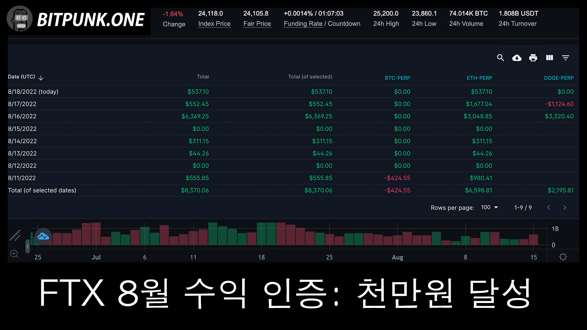 수익 PNL은 세분화해서 살펴보면 비트코인에서 -420달러. 이더리움에서 +6,600달러. 도지에서 +2,200달러입니다. (위에 배너 사진이 수익 인증 스샷입니다)