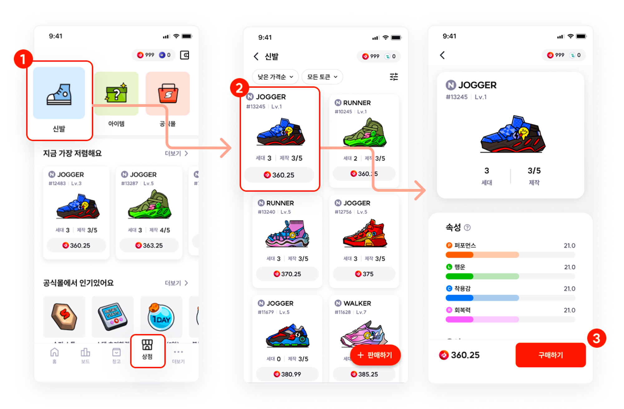 슈퍼워크 앱에 들어가신 다음 신발 마켓으로 이동해주세요. 다양한 신발들이 보일 것입니다. 아래와 같이 몇 번의 클릭을 통해 신발 구매를 완료할 수 있습니다.