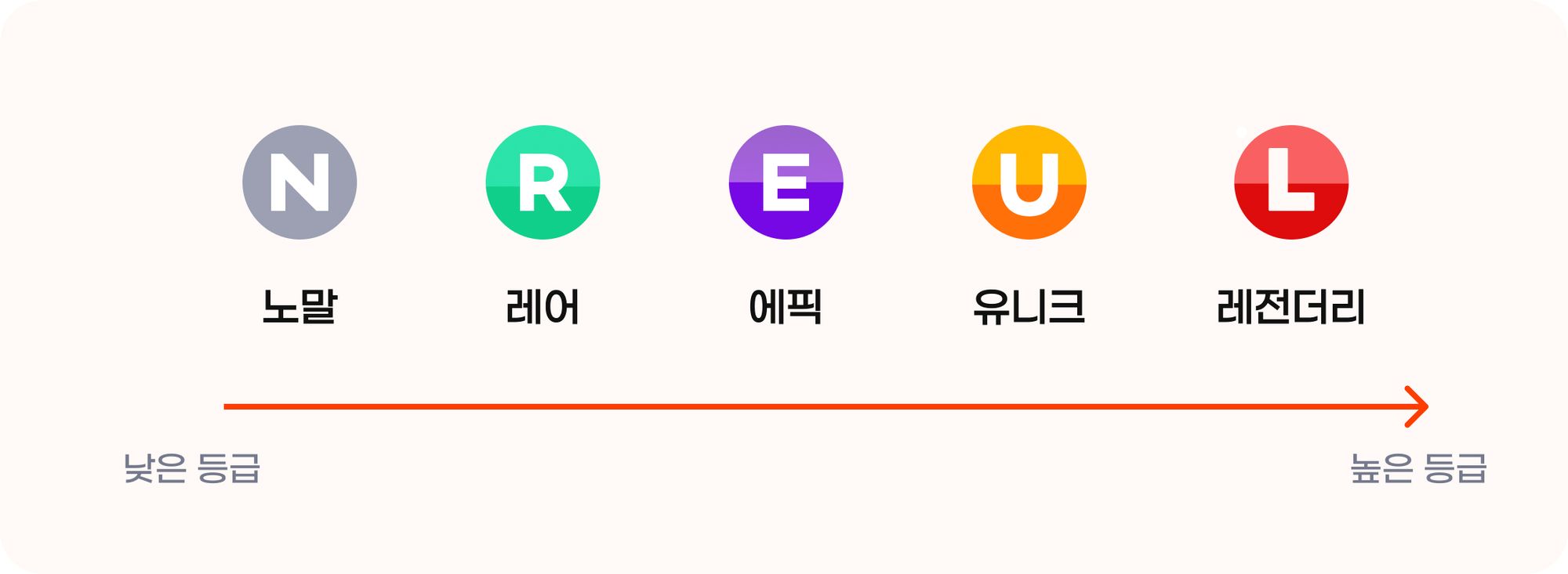 슈퍼워크 신발에는 노말, 레어, 에픽, 유니크, 레전더리 5가지 등급이 있습니다. 등급이 높을수록 신발의 능력치가 좋아집니다.