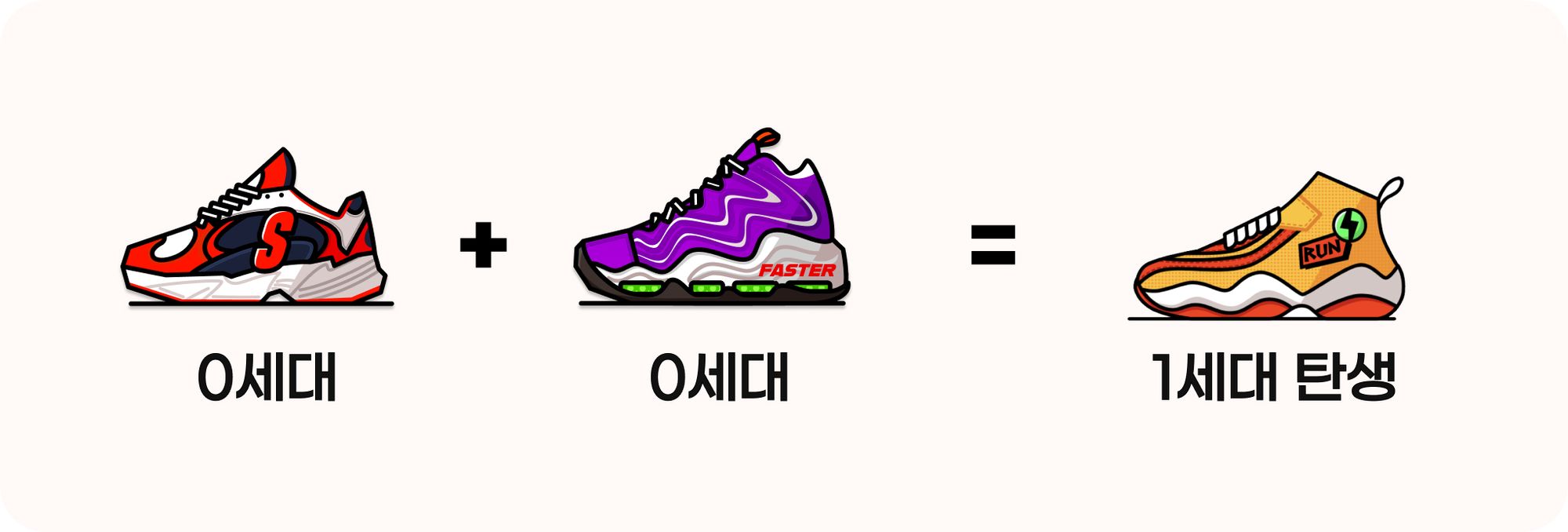 레벨 10 이상의 신발 2개로 새로운 신발을 제작(브리딩)할 수 있습니다. 제작된 신발은 부모 세대 신발 중 높은 세대에 +1을 한 세대가 됩니다.