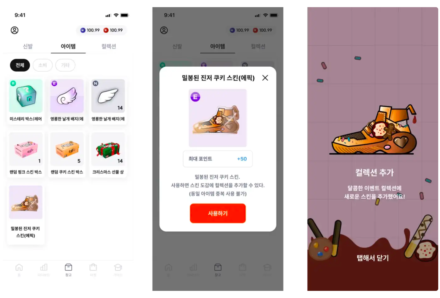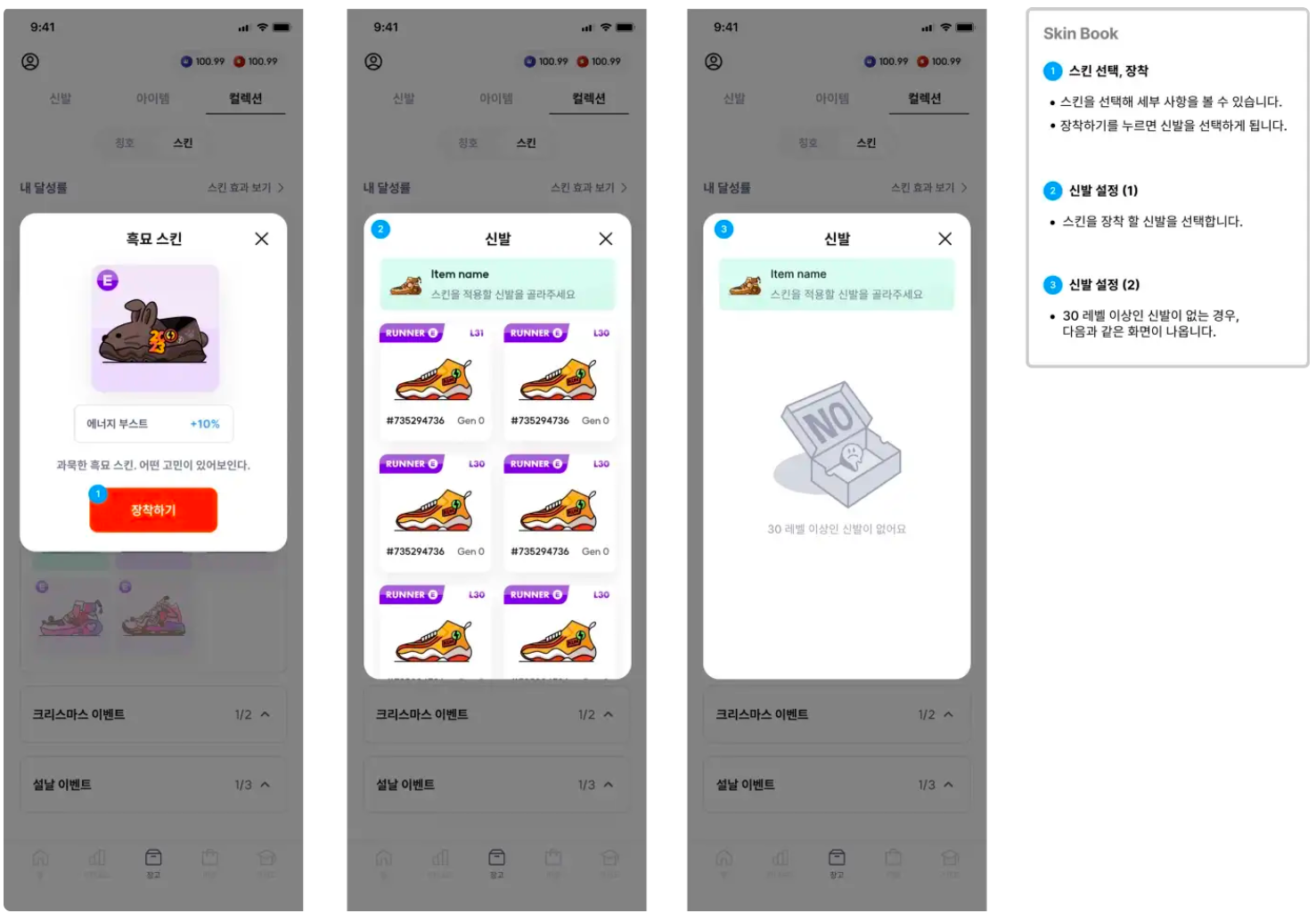 스킨을 개봉하셨다면 신발 탭에 들어가셔서 스킨을 장착하여 사용하실 수 있습니다. 스킨은 메인 신발이 아닌 다른 신발에도 적용이 가능하며, 동일한 스킨이 아닐 경우 해당 효과가 적용됩니다.
