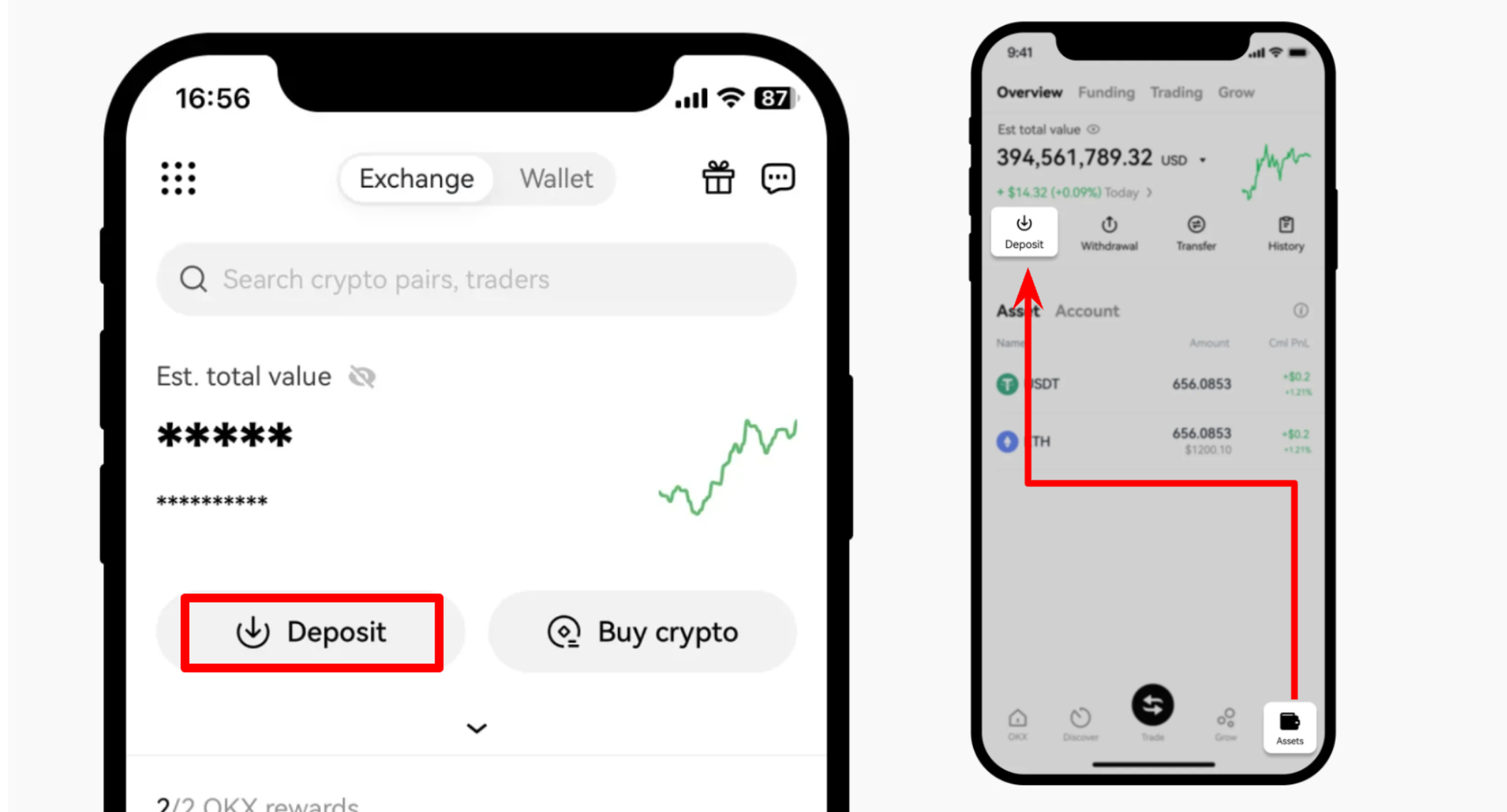 OKX 웹사이트 또는 앱에 로그인한 다음 입금 탭으로 이동하세요. 로그인 후 표시되는 첫 화면에서 [Deposit] 버튼을 눌러주세요. 또는 자산 [Assets] 섹션으로 이동한 다음 [Deposit Crypto]를 누르셔도 됩니다.