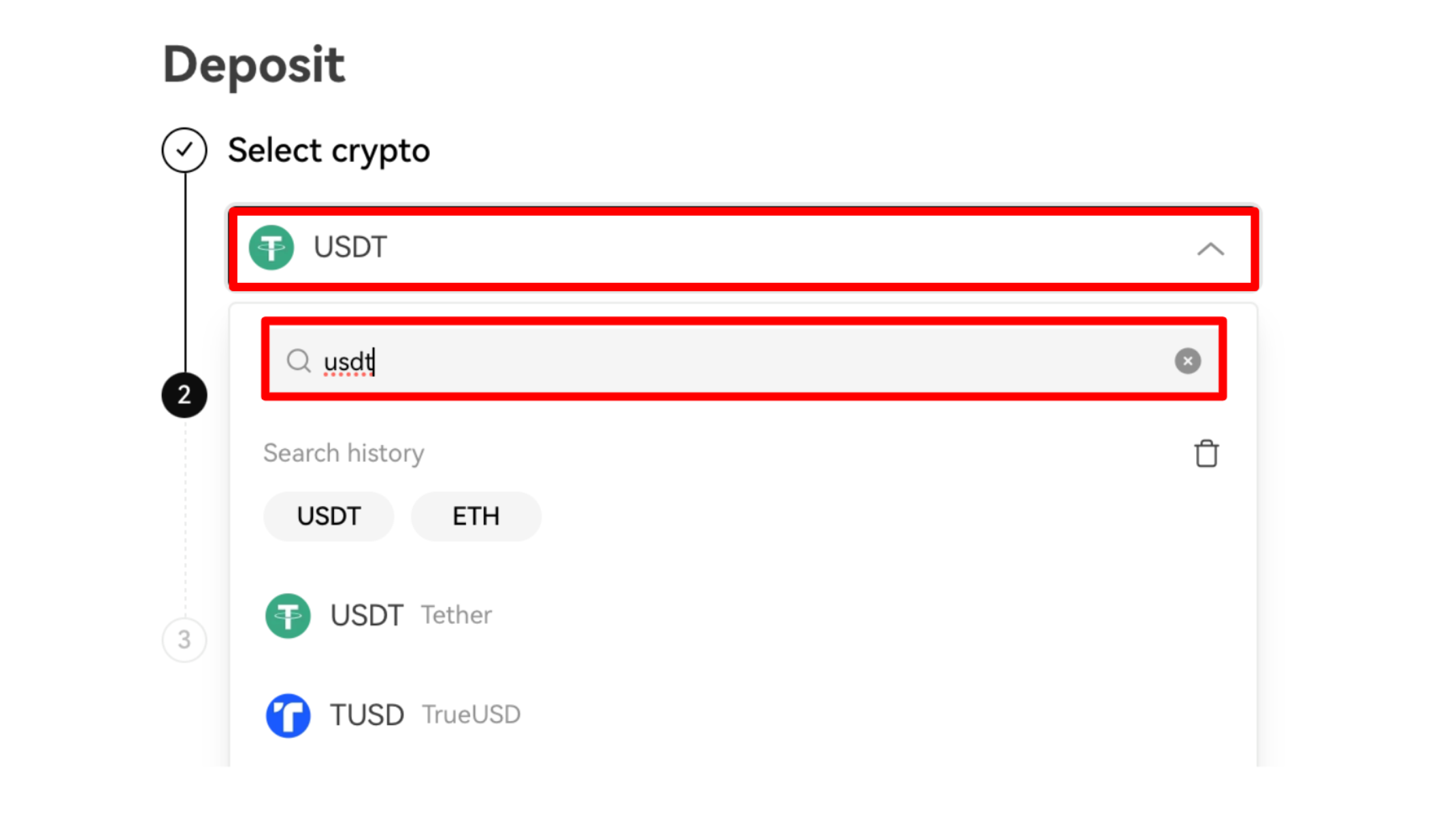 다음으로 입금할 가상자산을 선택해주세요. 트레이딩을 위한 자금 조달이 목적이라면, 수수료와 안정성 측면에서 USDT를 사용하시는 것이 가장 좋습니다.