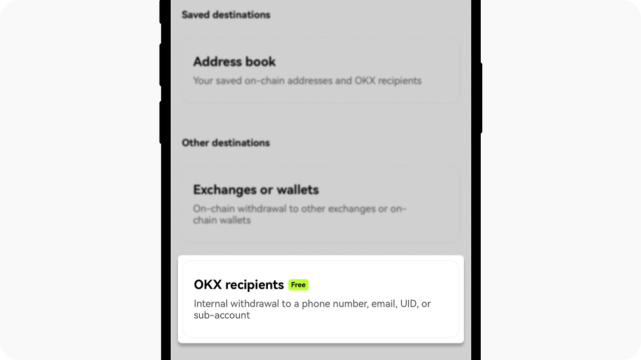 목적지(수령인) 주소에서 'OKX recipients'를 클릭하여 내부 전송을 진행할 수 있습니다. 참고로, 내부 전송을 완료하기 위해서는 두 계정 모두 신원 인증(KYC)를 완료한 상태여야 합니다.