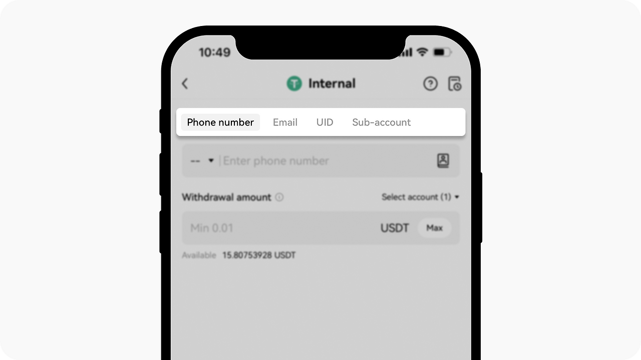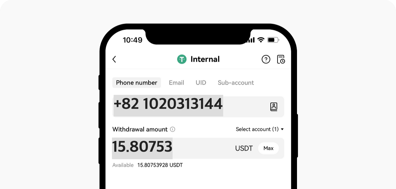 다음으로 수령인의 정보를 입력합니다. 선택 가능한 옵션으로는 전화번호 또는 이메일, 서브 어카운트, UID가 있습니다.