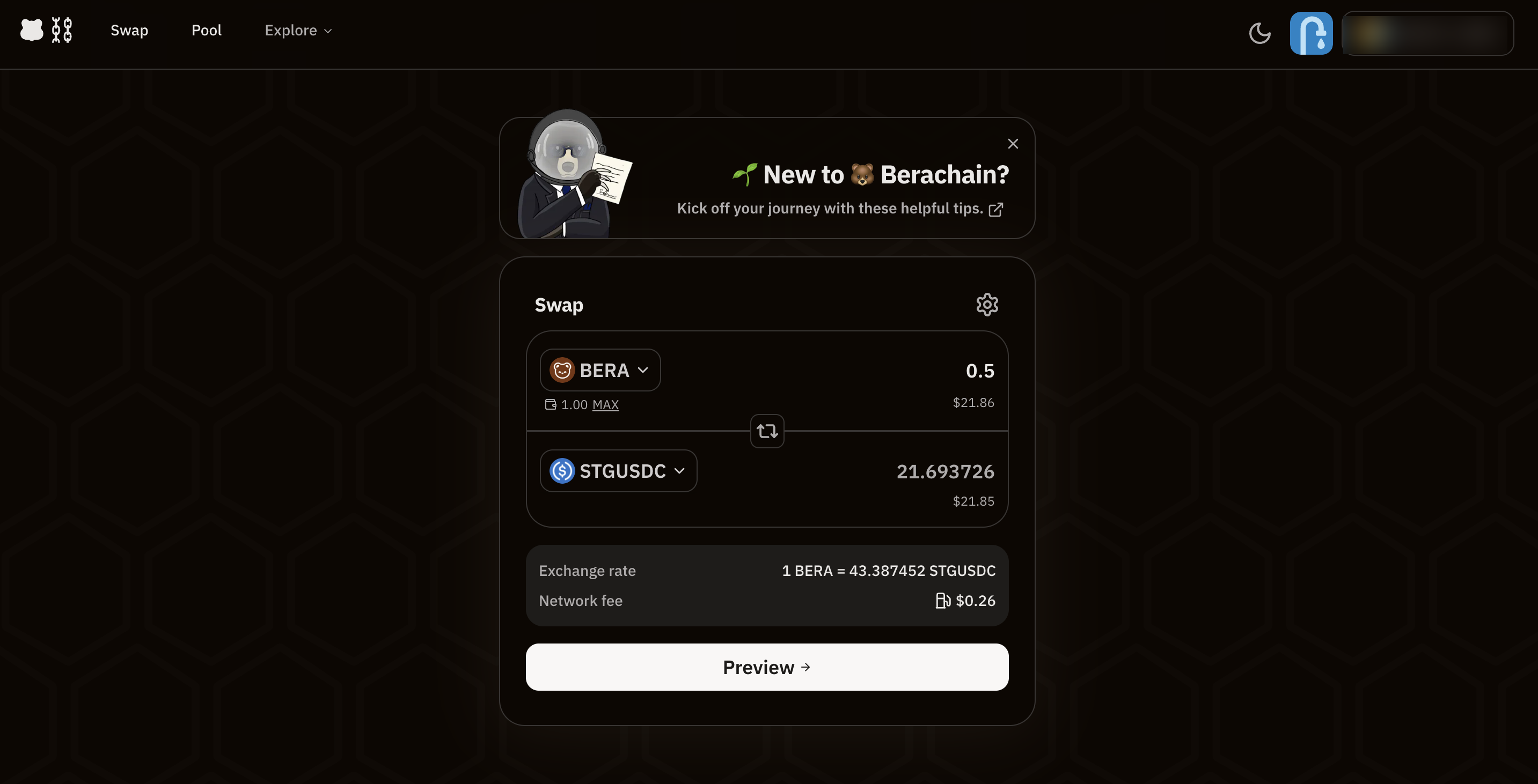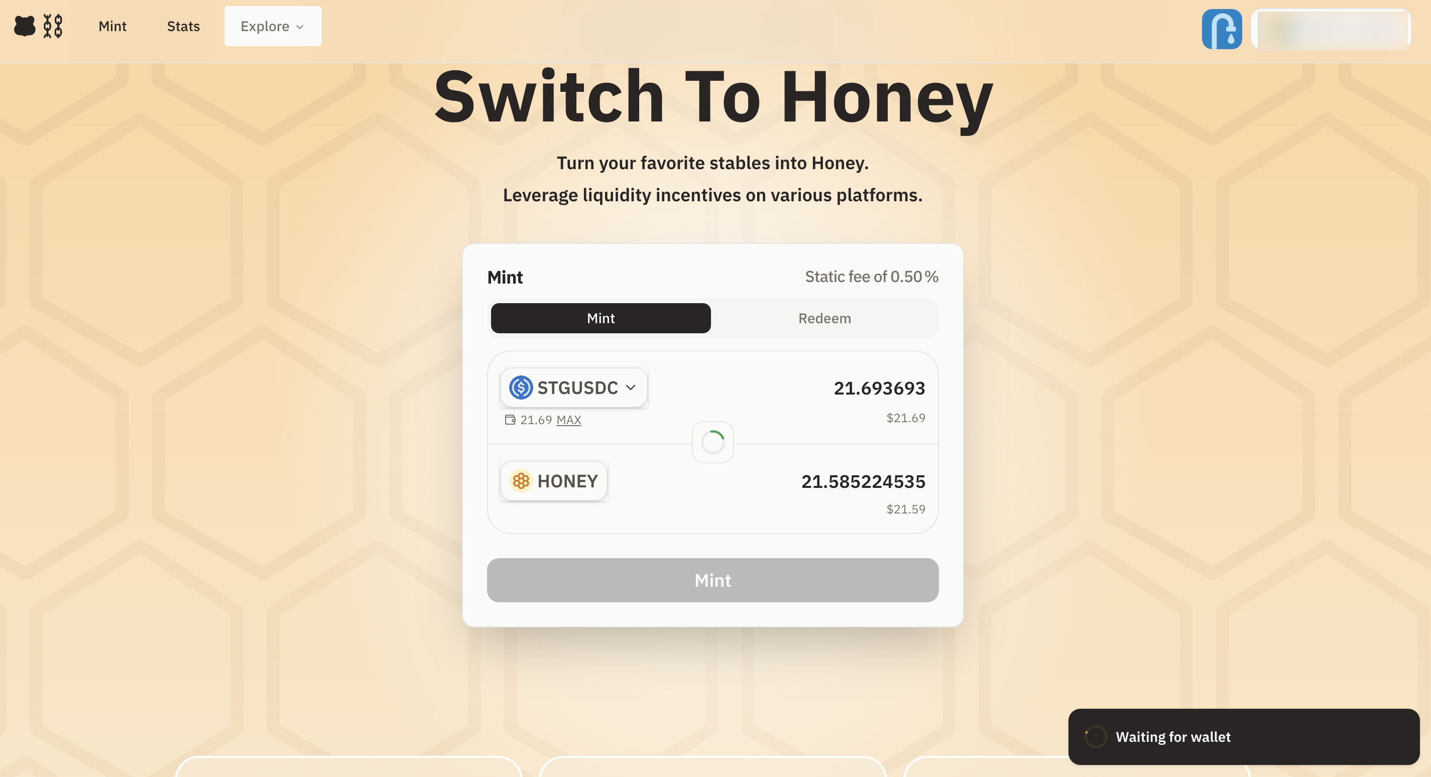 스테이블코인을 발행할 수 있는 허니 디앱으로 이동합니다. $STGUSDC를 $HONEY로 전환해주세요.