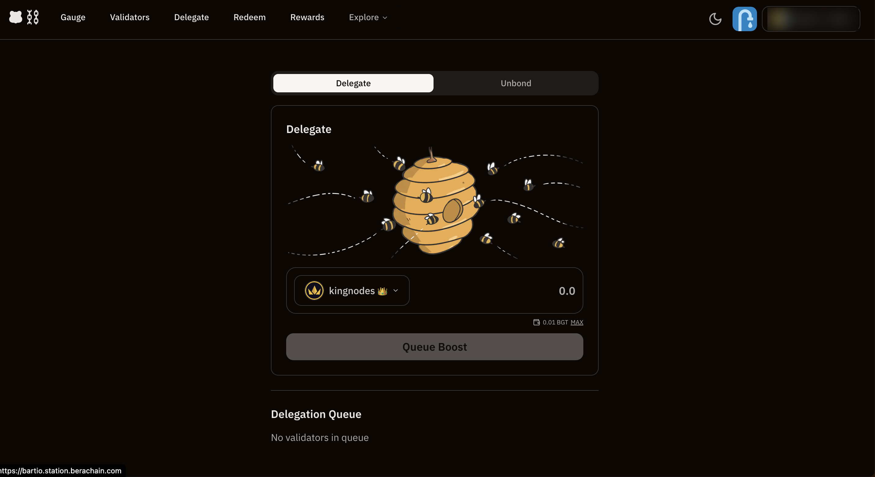 베라체인 스테이션에 지갑을 연결한 다음 $BGT를 위임하세요. 검증자 대표는 아무나 선택하셔도 무방합니다.