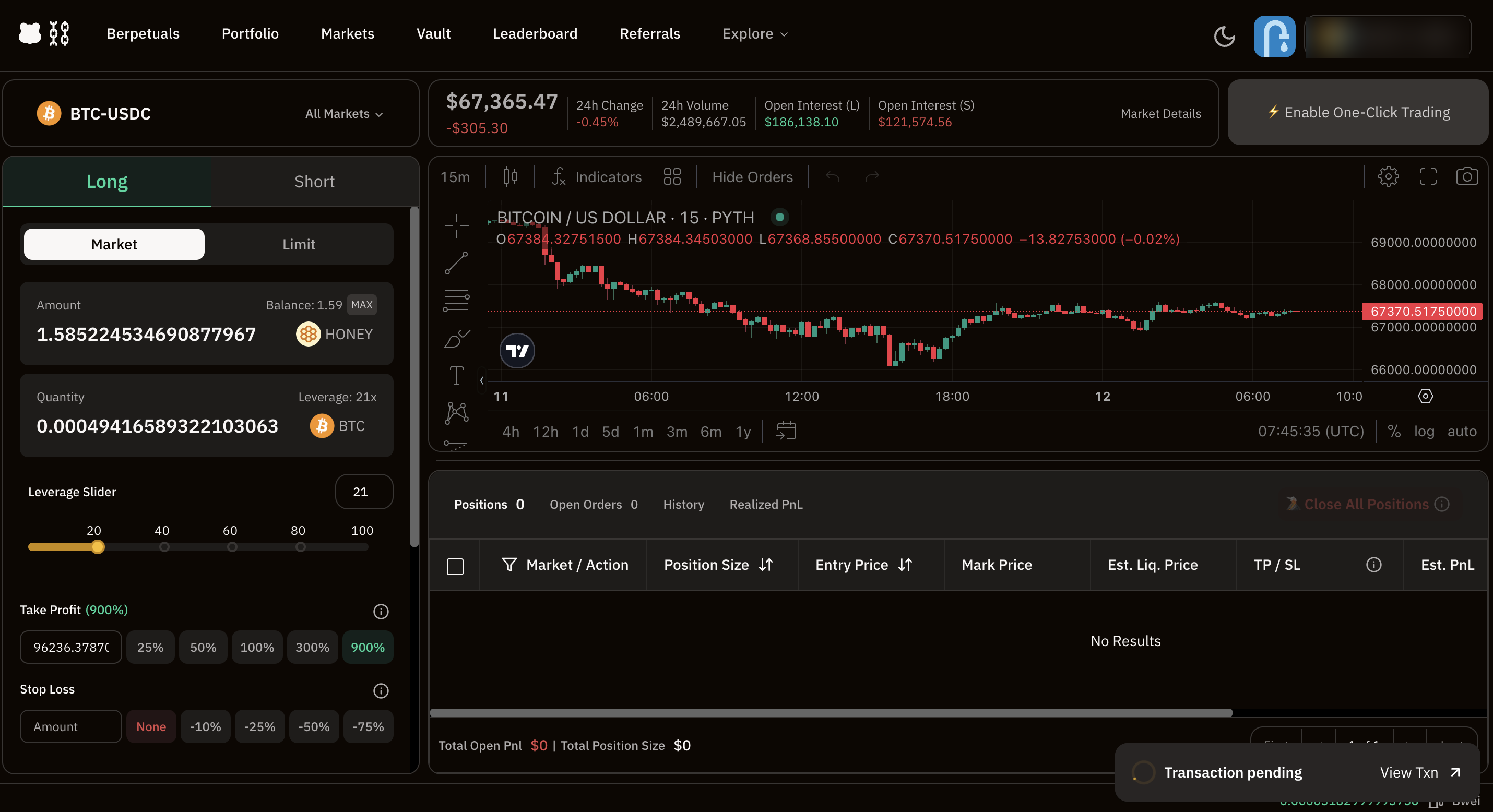 선물 거래 마켓인 BERPS로 이동해주세요. 보유하고 있는 스테이블코인인 $HONEY로 포지션을 개시할 수 있습니다.