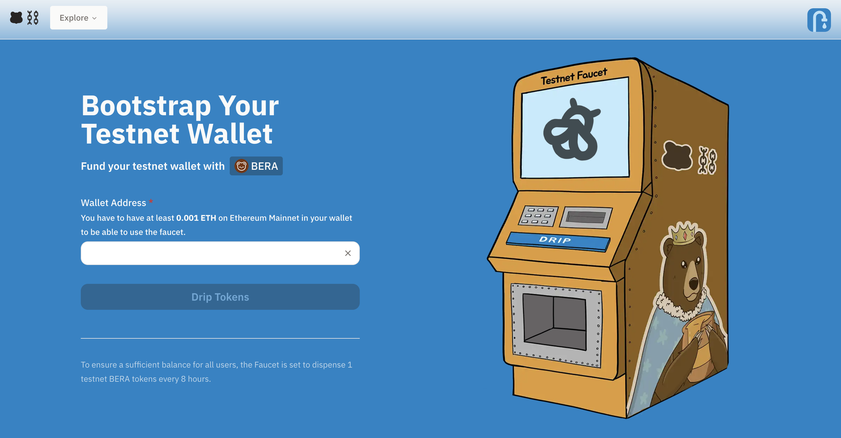 베라체인 facuet 주소는 다음과 같으며, 1 $BERA 토큰을 8시간 마다 받을 수 있습니다.