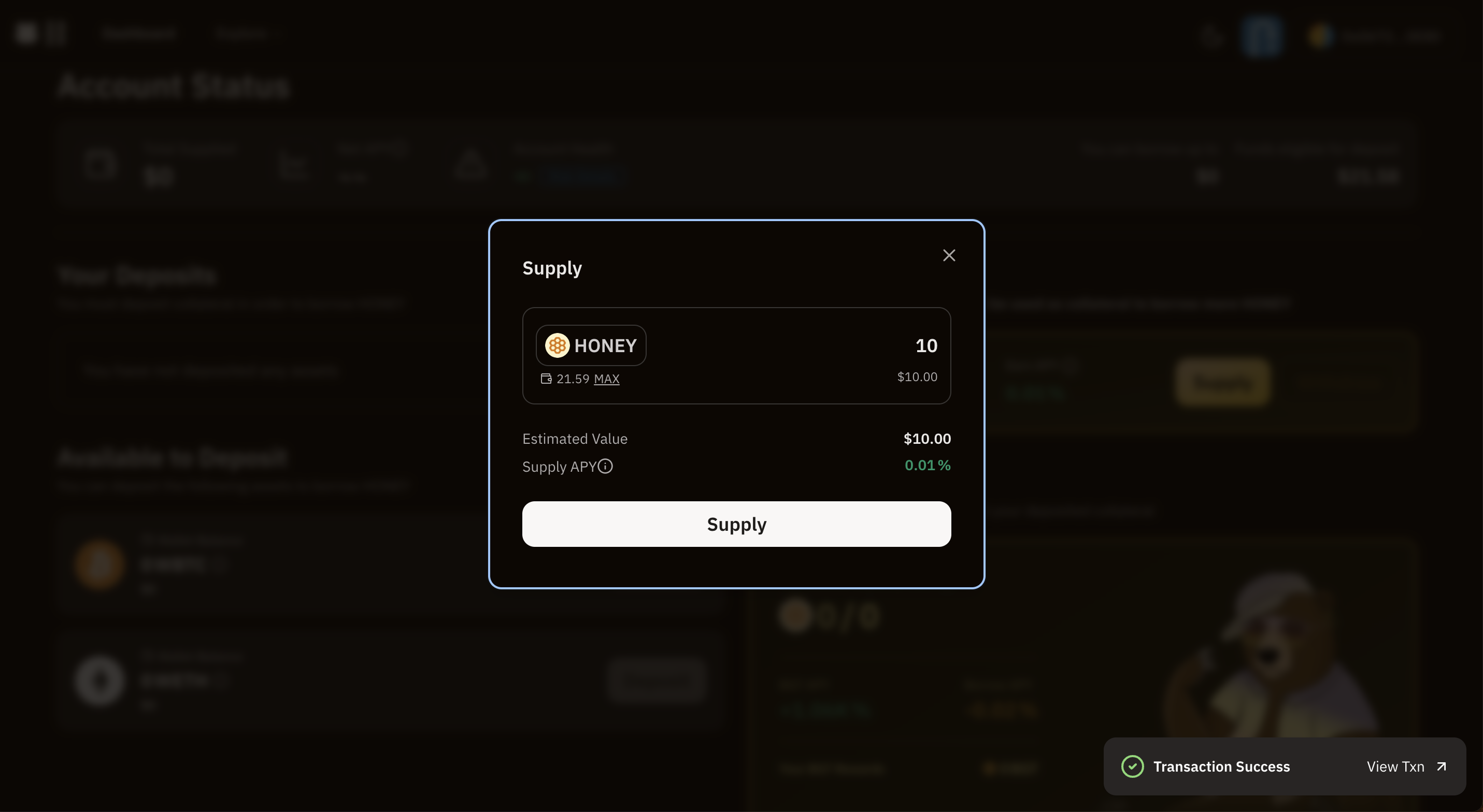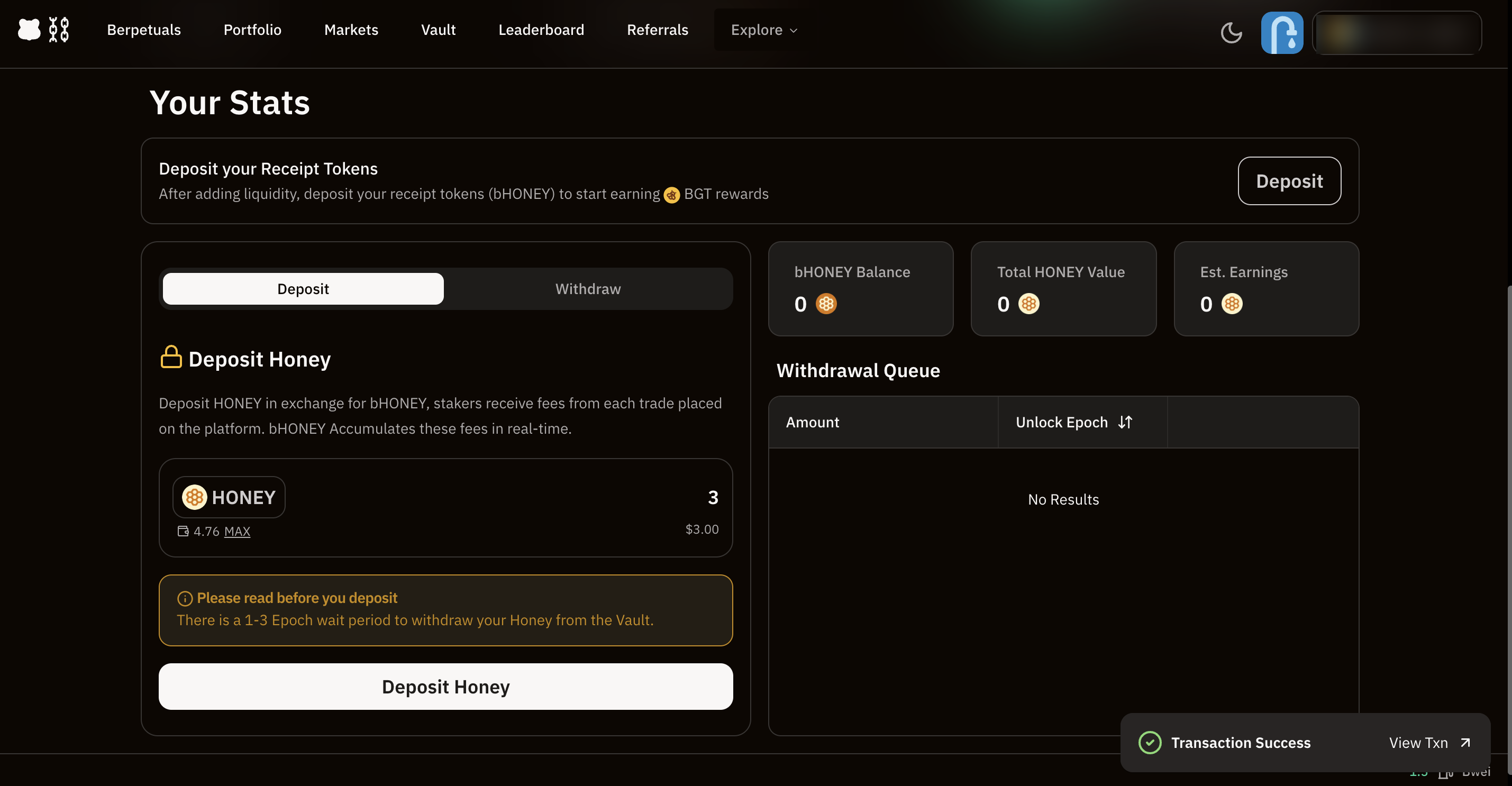 베라체인 볼트로 이동하여 $HONEY를 예치해주세요. 이에 대한 랩트 토큰으로 $bHoney를 받을 수 있습니다.