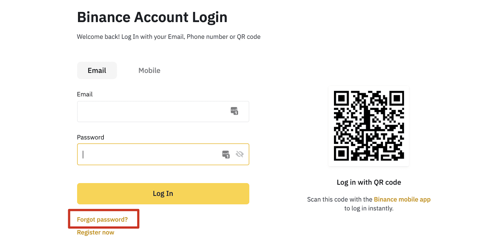 바이낸스 홈페이지로 이동하여 [로그인]을 클릭하세요. 바이낸스 앱을 사용하는 경우 [Loing/Register] 버튼을 클릭하시면 됩니다.