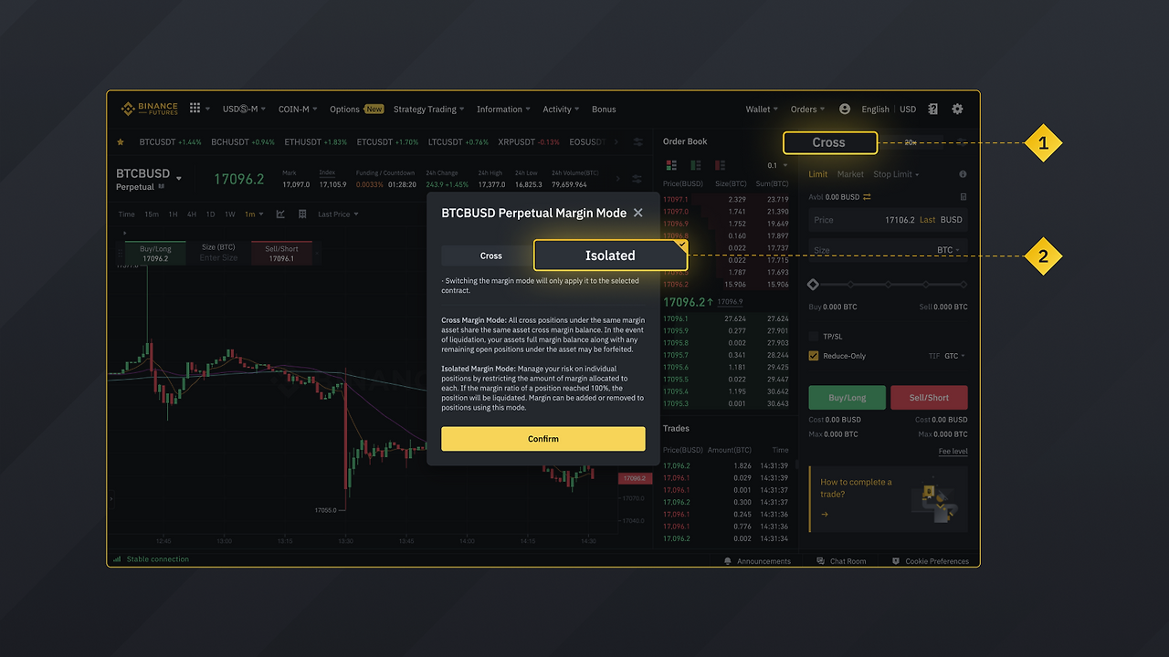 바이낸스 선물에서는 아래와 같이 간편한 교차(Cross) 및 격리(Isolated) 변경을 지원합니다. 참고로, 모드 변경을 위해서는 선물 계정에 보유하고 있는 포지션이 없어야 합니다.
