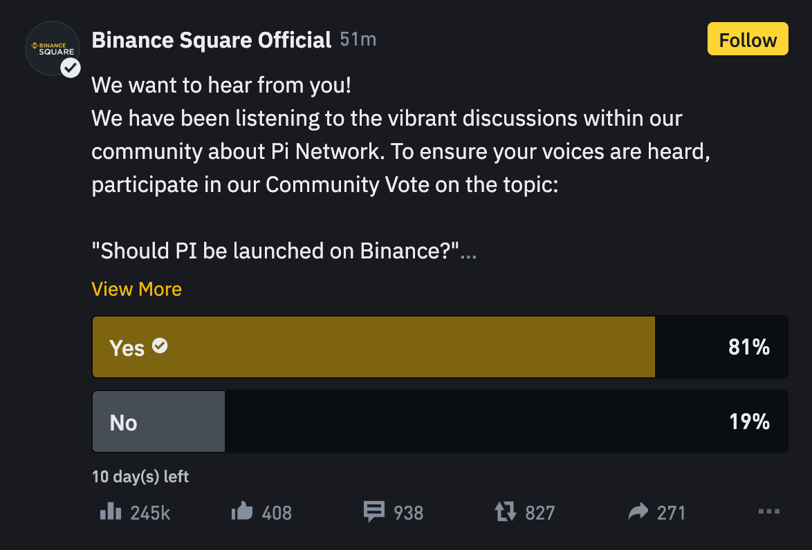 바이낸스는 파이코인 상장을 위해 스퀘어(Square)에서 커뮤니티 투표를 진행 중입니다. 파이코인이 바이낸스에 상장되길 원한다면, 다음 절차를 참고해 투표에 참여하실 수 있습니다.