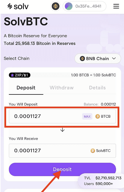 스테이킹할 BTCB 금액을 입력한 다음 [Deposit] 버튼을 탭하세요. 금액은 최소 0.0001 BTCB 이상이어야 합니다.