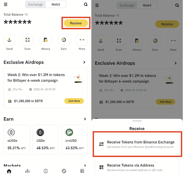 바이낸스 거래소에서 Web3 월렛으로 BTC를 전송해야 합니다. 웹3 지갑에서 [Receive Tokens from Binance Exchange] 선택 후, 보유하고 있는 BTC 자산을 전송할 수 있습니다.