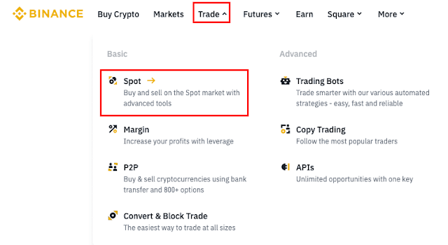 먼저 바이낸스 공식 웹사이트에 로그인하고, 현물 거래로 이동합니다. 상단 메뉴에서 [Trade] → [Spot]을 선택하세요.
