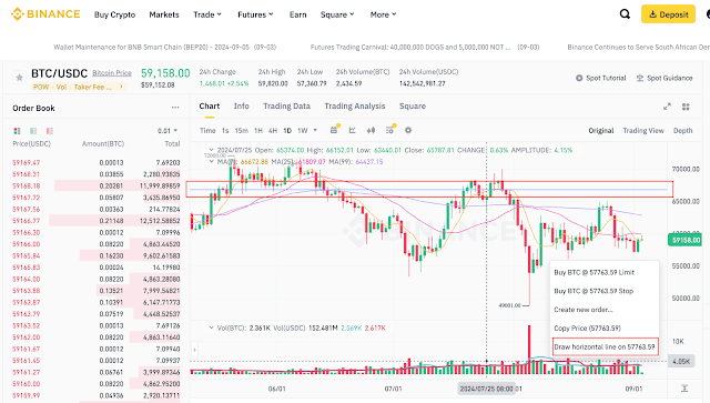 거래 차트에서 마우스 오른쪽 버튼을 클릭합니다. [Draw Horizontal Line]을 클릭하여 특정 가격 위에 가로선을 표시할 수 있습니다. 이를 통해 특정 가격 범위를 시각적으로 확인하고 조건부 주문(예: 스탑 로스)을 설정하는 데 활용할 수 있습니다.