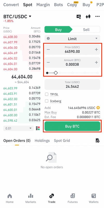 예를 들어, 비트코인이 제출한 주문 가격에 도달한 경우 USDC가 BTC로 전환되어 현물 지갑에 반영됩니다. 반대로, 매도하는 경우에는 BTC가 USDC로 전환되어 반영됩니다.