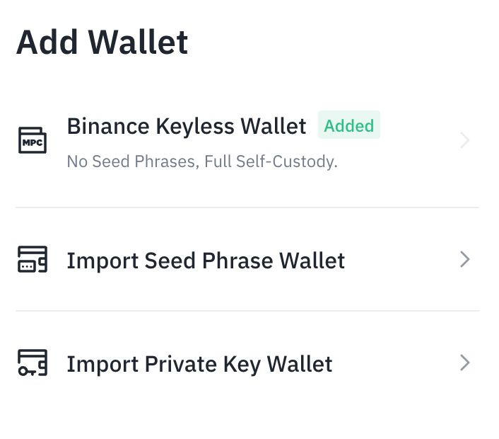 바이낸스 월렛은 바이낸스 거래소에서 직접 출시한 셀프 커스터디 웹3 지갑입니다. 바이낸스 사용자라면 누구나 간편하게 키리스 지갑을 생성할 수 있으며, 별도로 시드 문구를 관리하지 않아도 된다는 장점이 있습니다.