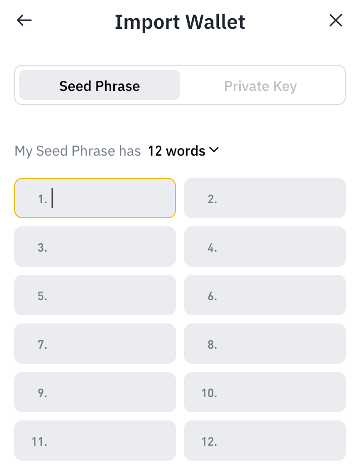 바이낸스 월렛에서는 시드 문구 또는 개인 키를 통해 다른 지갑을 불러올 수도 있습니다. 'Import Seed Prhase' 또는 'Import Private Key' 옵션을 사용하여, 메타마스크나 OKX 월렛 등 기존에 사용하던 지갑을 연동하여 사용할 수 있습니다.