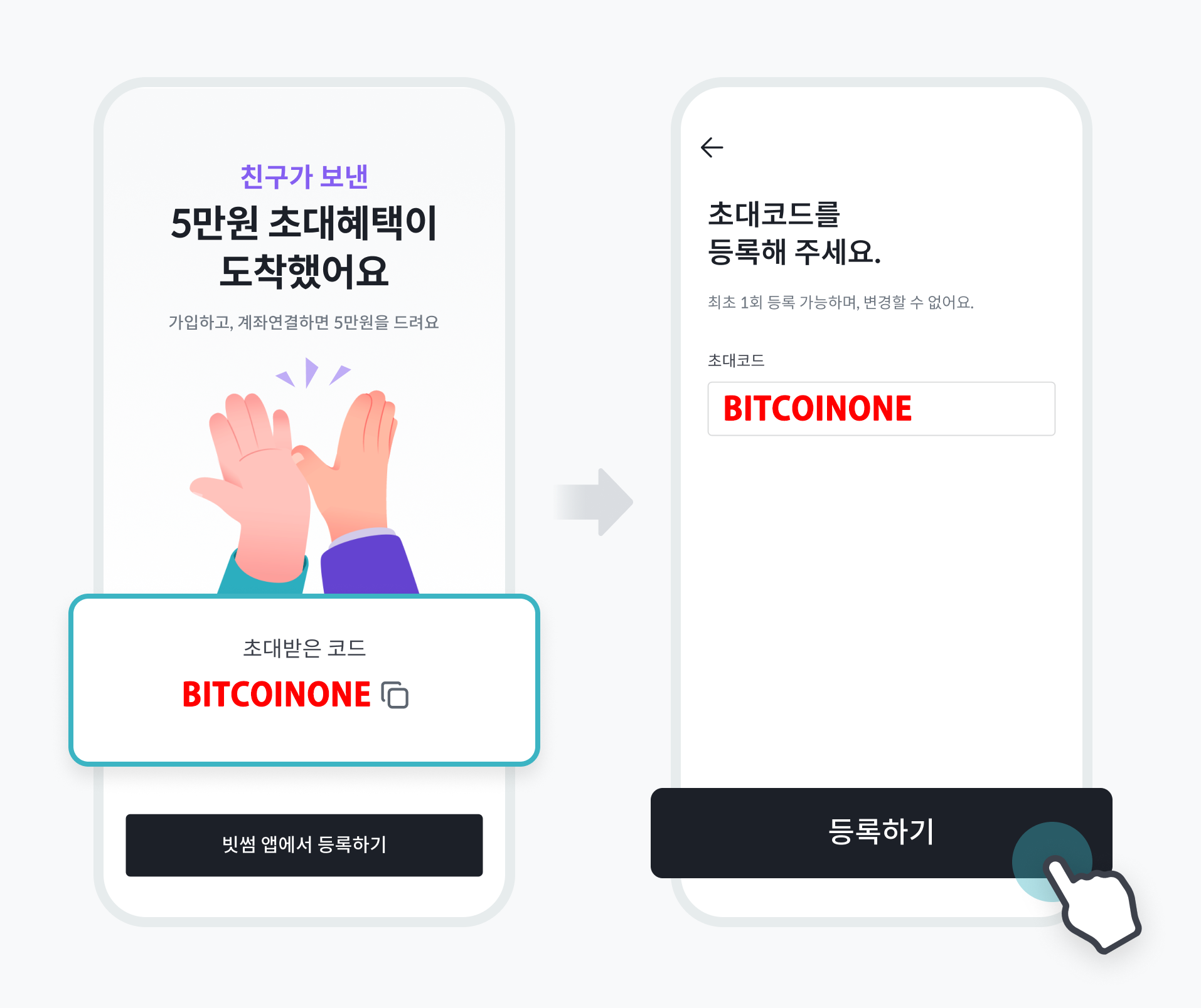 | 2단계 | 초대코드 BITCOINONE 입력 |