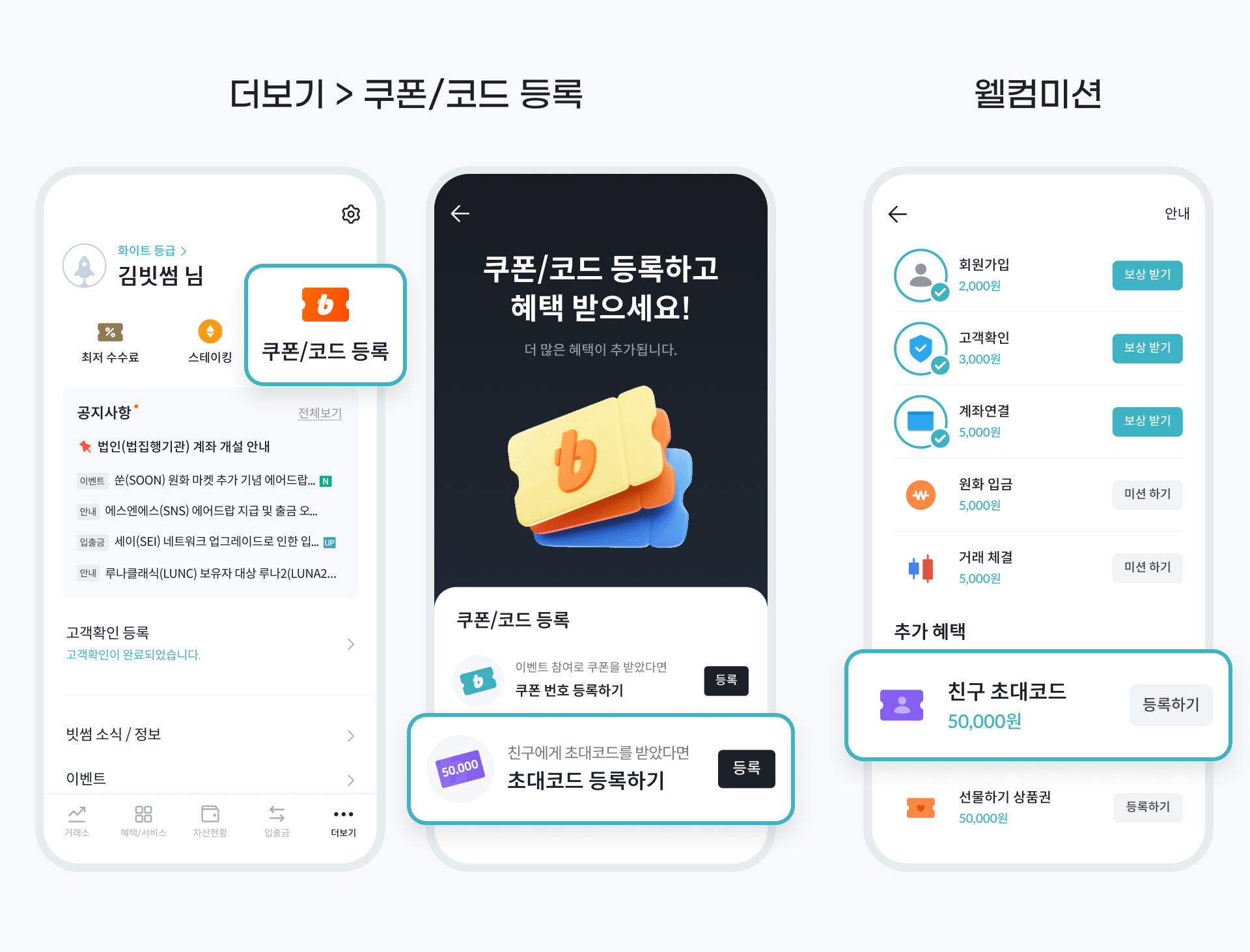 그럼 첫 번째 보상부터 시작해볼까요? 먼저, 빗썸 초대코드 쿠폰을 등록하는 방법은 다음과 같습니다. 모바일 앱 기준으로 [더보기] > [쿠폰/코드 등록] > [초대코드 등록]으로 이동해주세요.