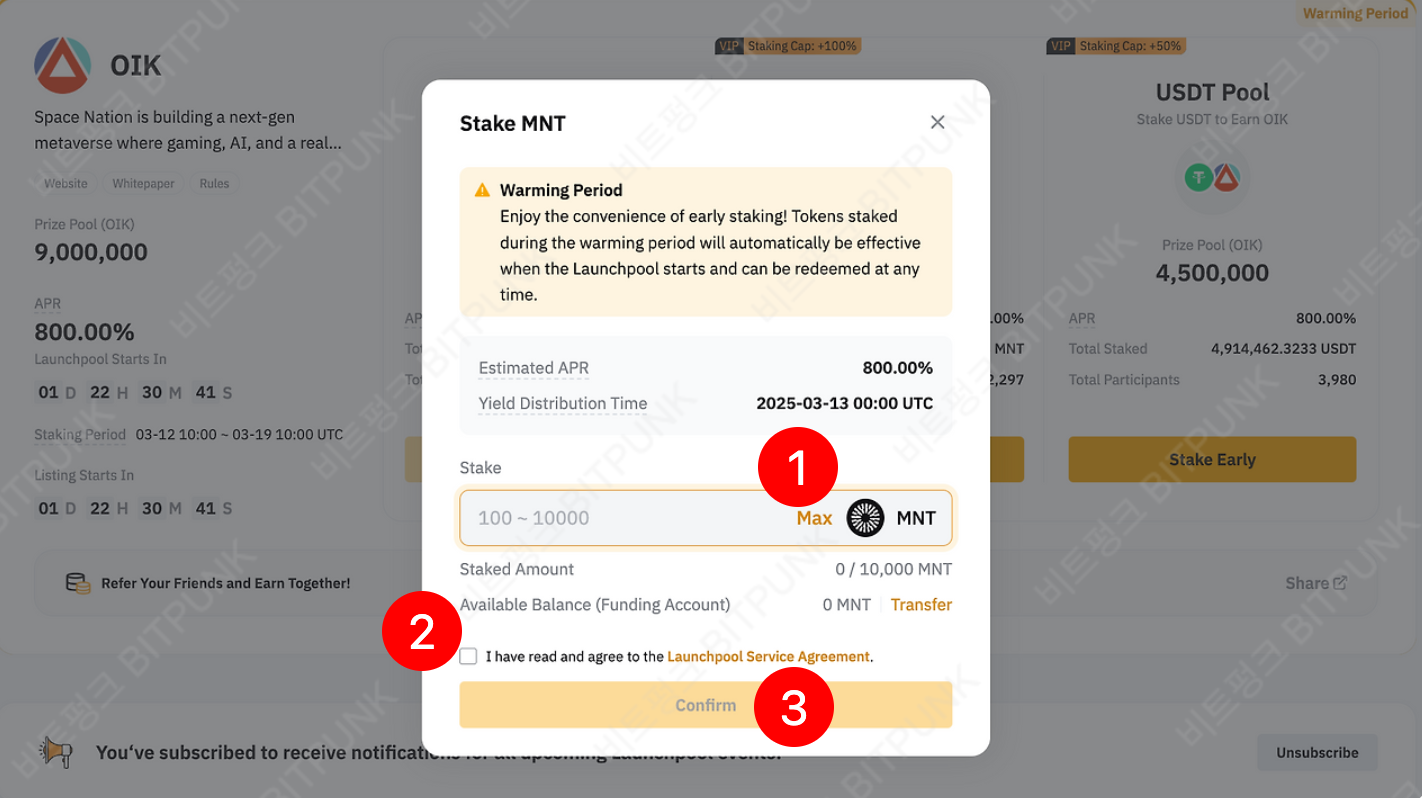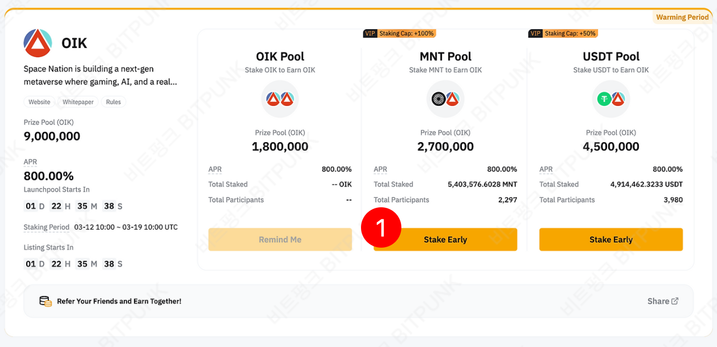 예를 들어, 지난 번에 진행되었던 OIK 런치풀의 경우에는 OIK 풀, 맨틀 풀, USDT 풀 이렇게 3가지가 열렸습니다. 여기서 참가를 원하는 풀에 해당하는 자산을 원하는만큼 스테이킹해주시면 되는데요.