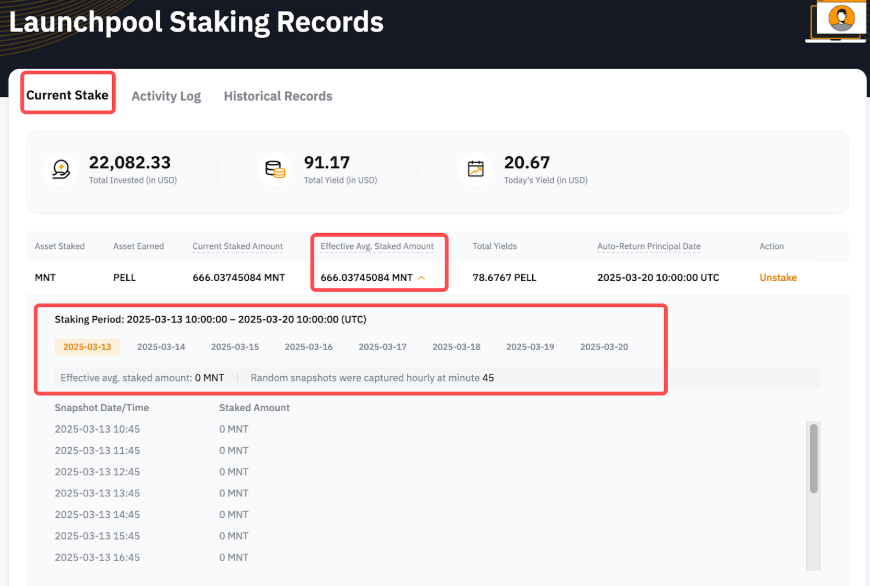 바이비트 런치풀은 매시간 랜덤하게 스테이킹 스냅샷을 진행합니다. 이후, 하루 동안 기록된 스냅샷을 기반으로 평균 스테이킹 수량을 계산하는데요. 이를 바탕으로 전체 보상 대비 사용자의 스테이킹 수량 비율에 따라 런치풀 보상을 지급합니다.