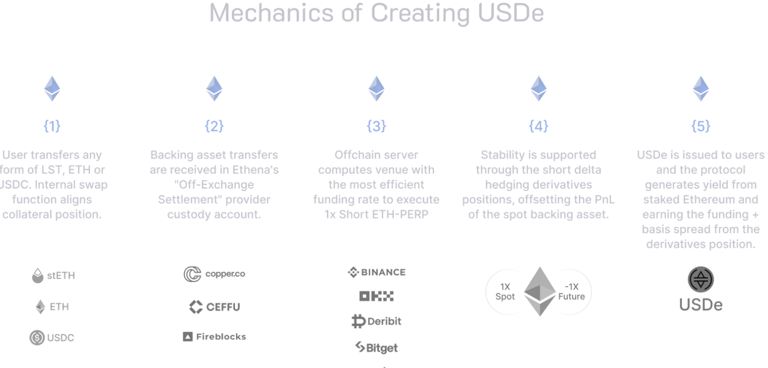- 사용자가 ETH(이더리움)를 담보로 예치하면, 상응하는 스테이블코인 USDe가 발행됩니다.