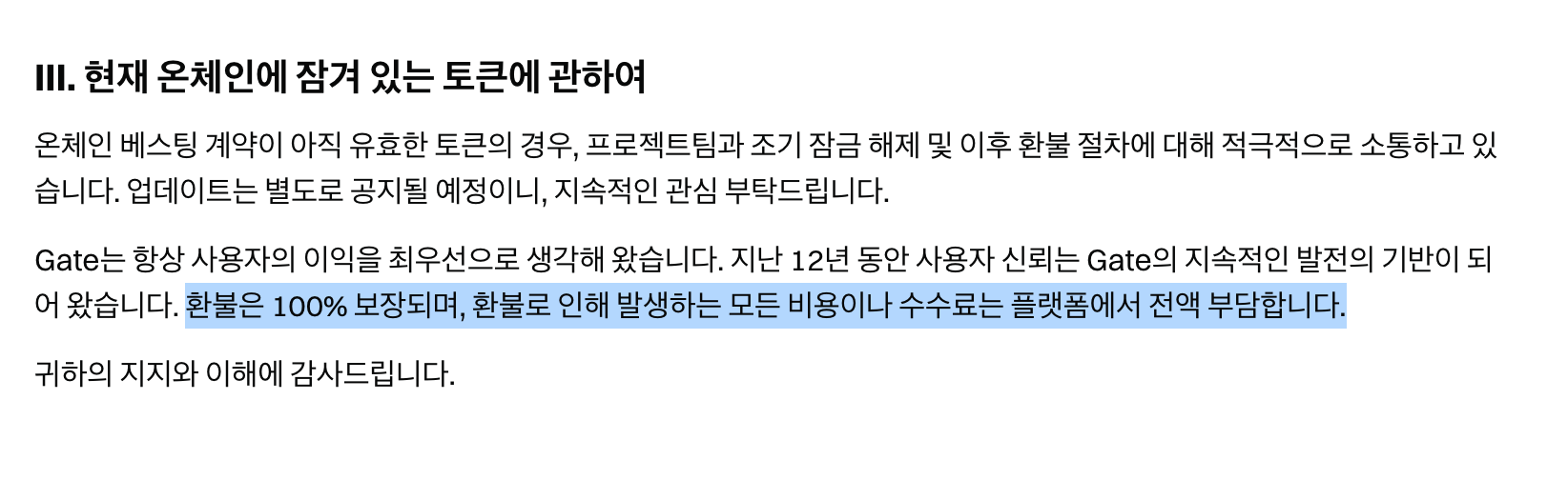그 이유는 게이트에서 진행한 런치패드가 세일가 이하로 떨어졌을 때 환불을 해준다는 공지 때문이었습니다. 게이트 거래소는 런치패드 토큰 가격이 세일가 이하에서 거래될 때 이를 환불해주는 정책을 운영 중입니다.