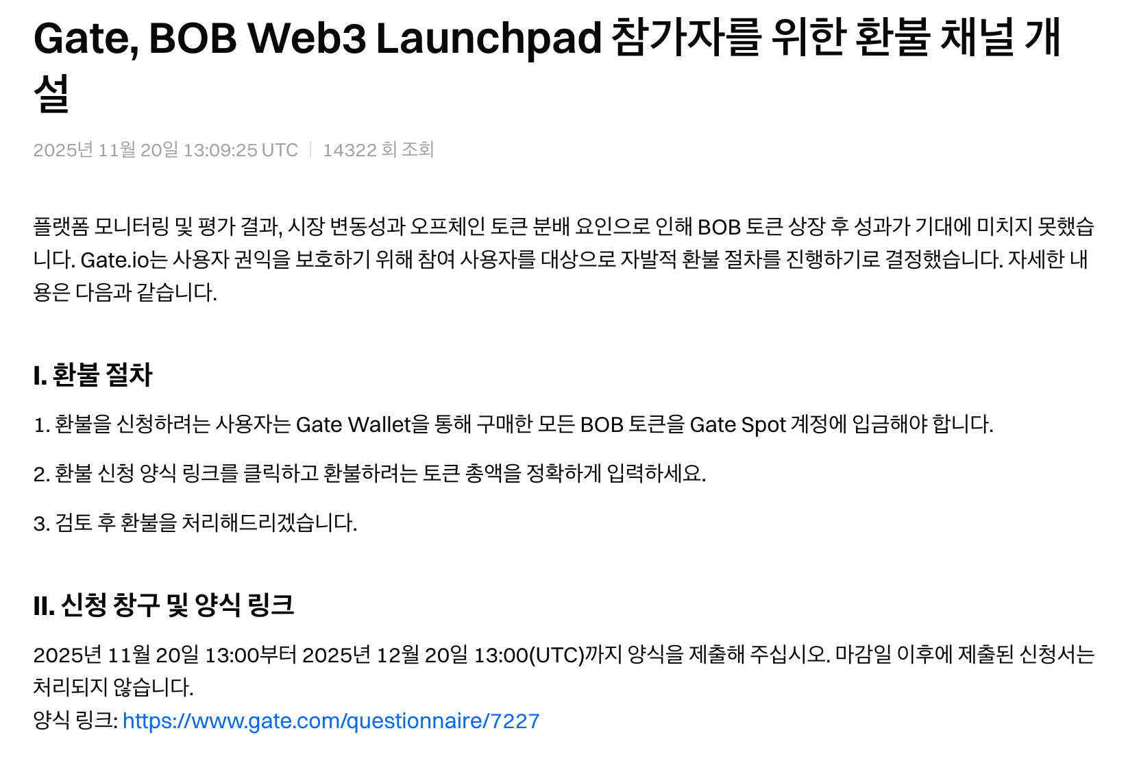 런치패드 환불 공지에 보시면 BOB 토큰 상장 후 성과가 기대에 미치지 못하였으며, 원하는 사용자를 대상으로 환불을 진행해 준다는 내용이 안내되어 있습니다.