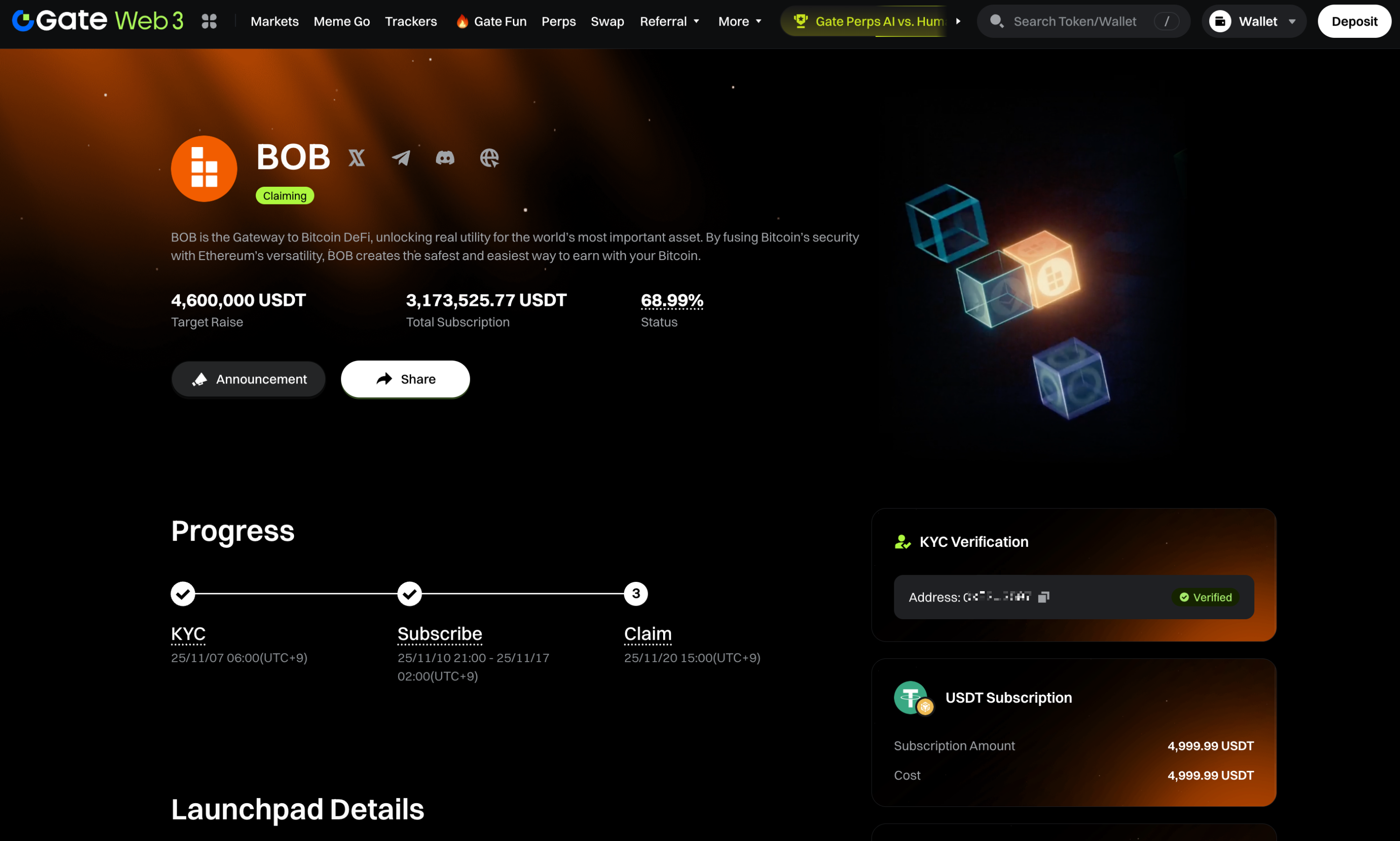 결론적으로 5,000 USDT를 청약했습니다. 그러나 세일은 목표 금액 미달로 끝났고, 모든 금액을 배정받았습니다. 문제는 런치패드 이후 BOB 토큰 가격이 꽤나 크게 하락했다는 것입니다.