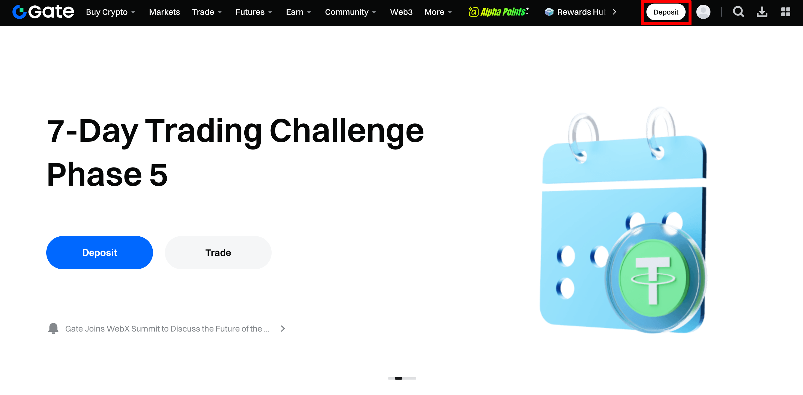 게이트 거래소에 접속한 다음, 우측 상단의 'Deposit' 버튼을 클릭합니다.