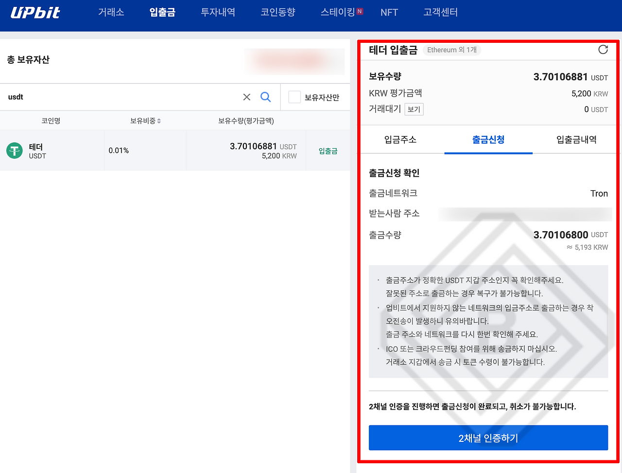 출금 플랫폼으로 이동하여 해당 입금 주소를 붙여 넣고, 정확한 네트워크를 선택합니다. 위에서 USDT를 트론 네트워크로 입금하기로 했으므로, 아래와 같이 동일하게 설정해주시면 됩니다.