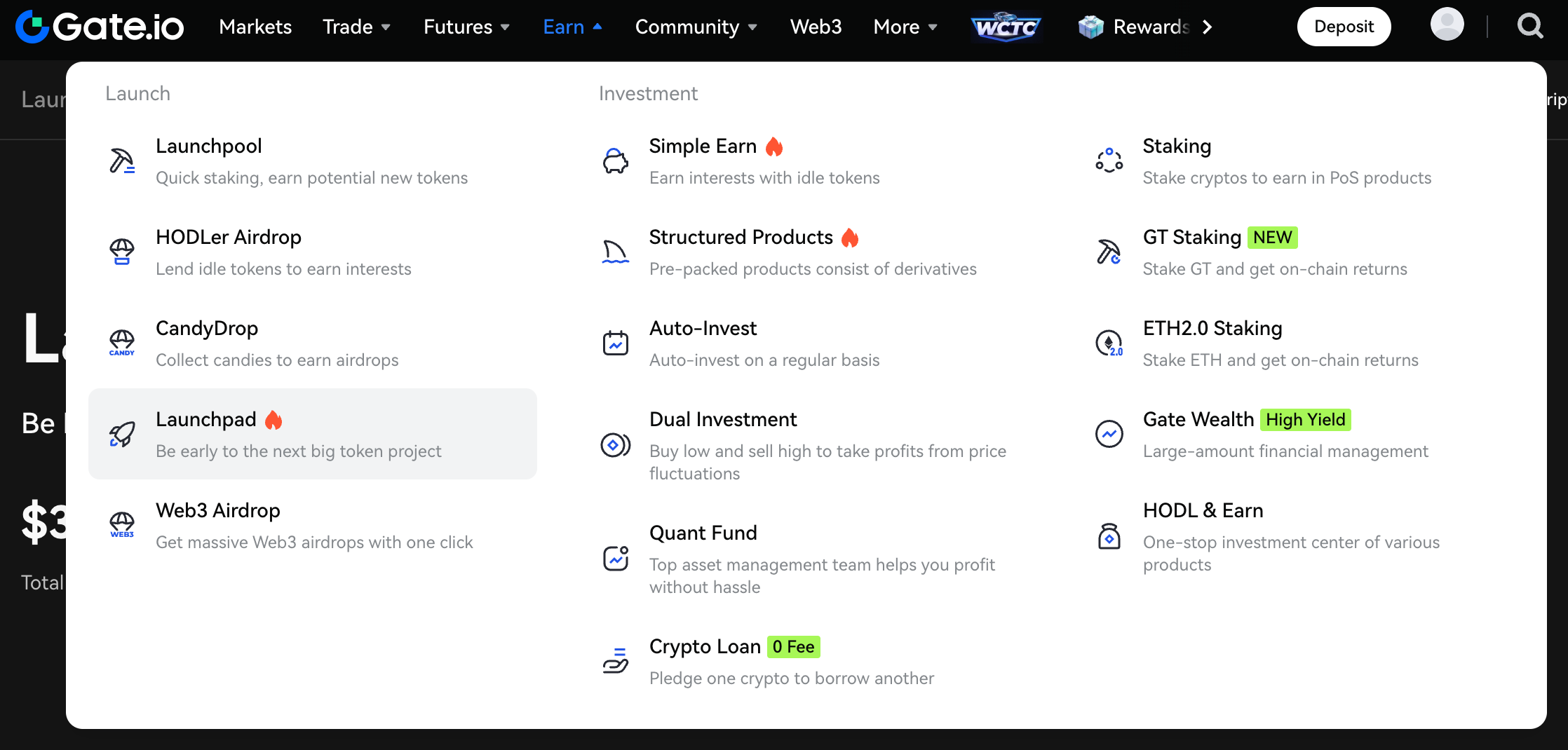 1. 게이트에 로그인한 뒤 메뉴에서 'Earn' - ‘Launchpad’를 클릭합니다.