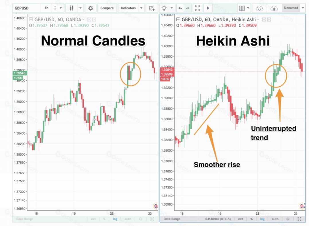 예를 들어, 일반 캔들은 가격이 상승하면 무조건 양봉이고, 가격이 하락하면 무조건 음봉입니다. 그러나 하이킨 아시는 평균값을 통해 캔들을 그리기 때문에 추세를 따라 동일한 색상의 캔들이 연속적으로 표시되는 경우가 많습니다.