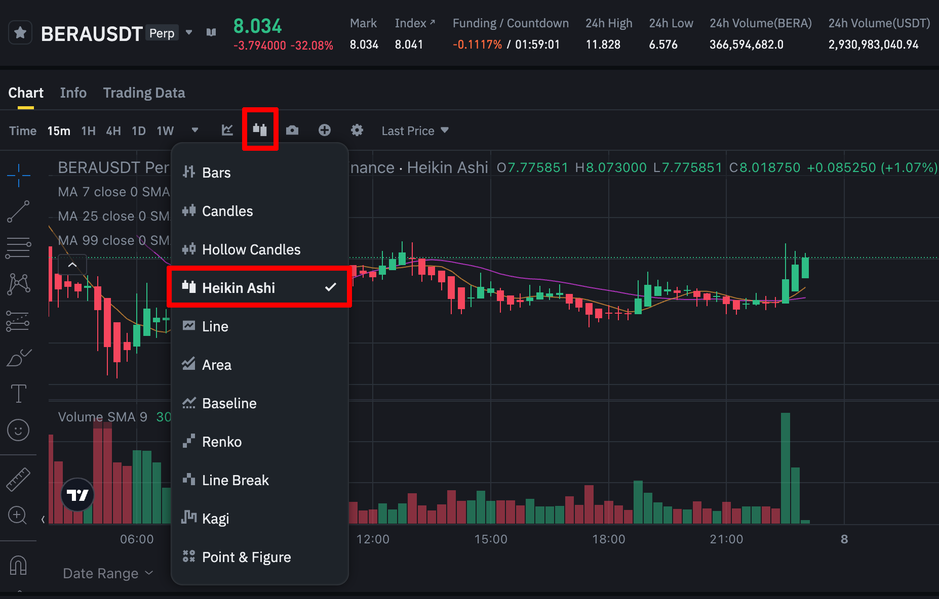하이킨 아시 캔들은 캔들 유형을 변경하는 옵션에서 설정할 수 있습니다. 바이낸스나 바이비트 또는 트레이딩뷰로 이동한 다음, 캔들스틱 → 하이킨 아시(Heikin Ashi)를 선택하세요. 기존의 캔들 스틱 차트가 하이킨 아시 차트로 변경됩니다.