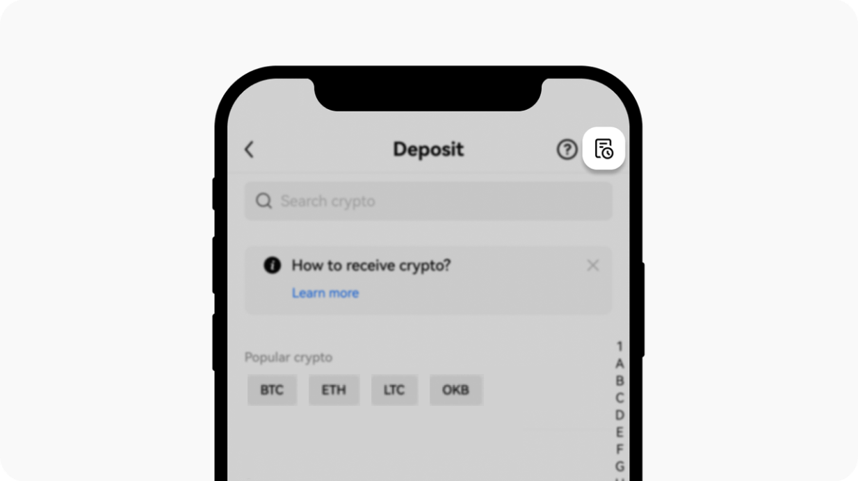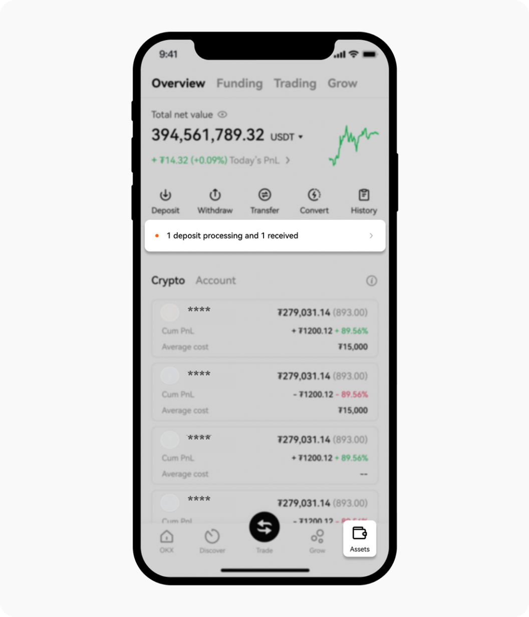 OKX 앱을 실행한다음 [Assets] 페이지로 이동하세요. 여기에서 현재 진행 중이거나 최근에 완료된 입금 내역을 확인할 수 있습니다.